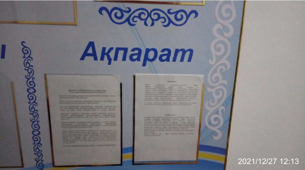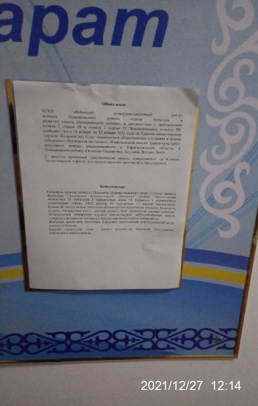 По проекту: Капитальный ремонт здания культурно-досугового центра, расположенного в Карагандинской области, в Осакаровском районе, в поселке Осакаровка, по улице Новая, №43