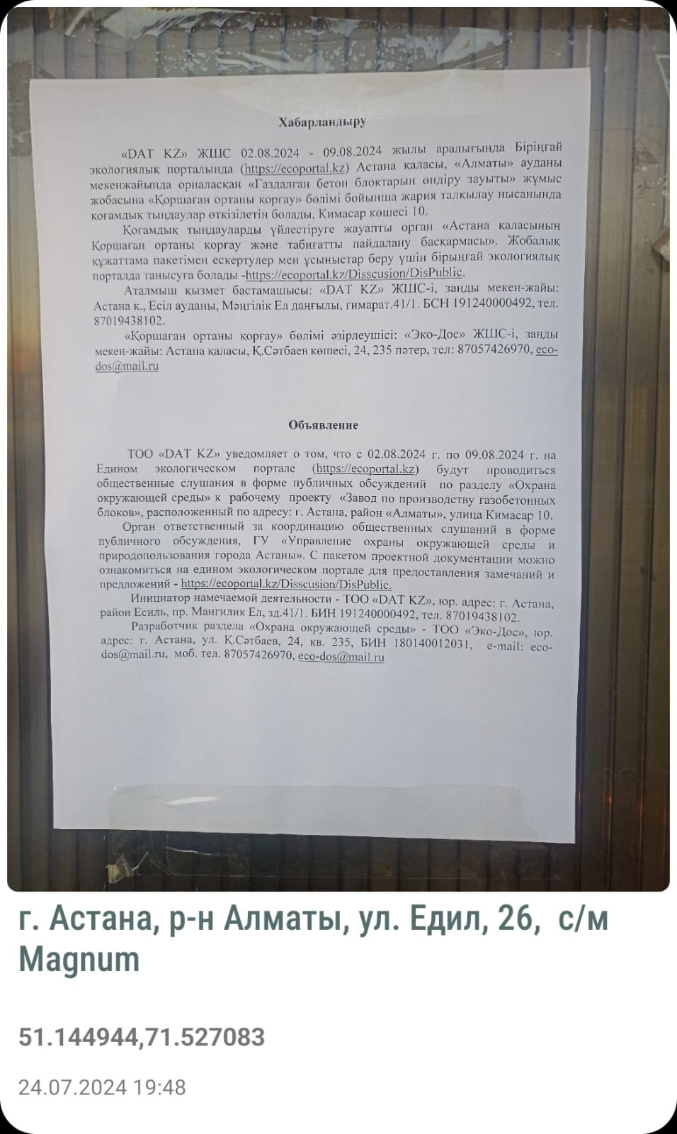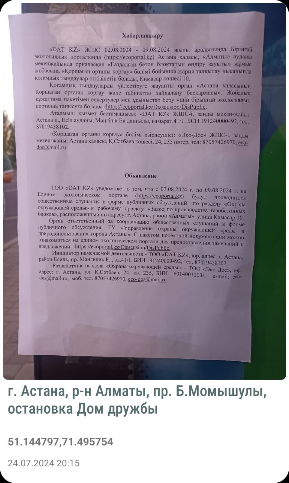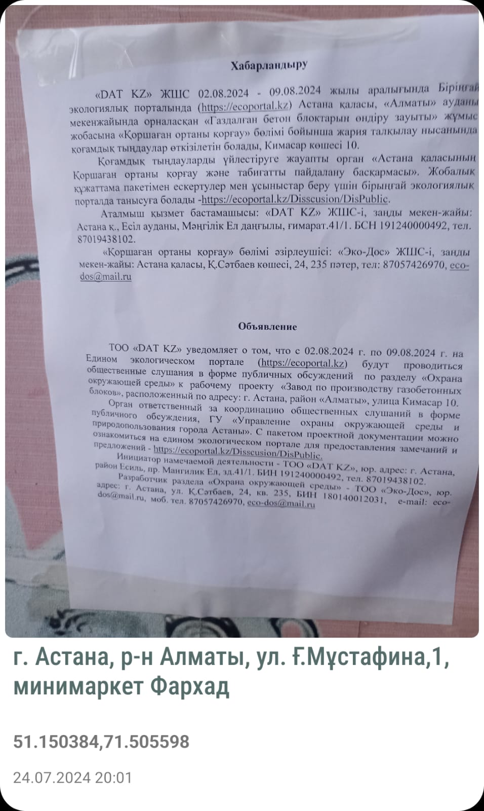 4.2. Дополнительная информация о административно-территориальных единиц: Хабарландыру «DAT KZ» ЖШС 02.08.2024 - 09.08.2024 жылы аралығында Біріңғай экологиялық порталында (https://ecoportal.kz) Астана қаласы, «Алматы» ауданы мекенжайында орналасқан «Газдалған бетон блоктарын өндіру зауыты» жұмыс жобасына «Қоршаған ортаны қорғау» бөлімі бойынша жария талқылау нысанында қоғамдық тыңдаулар өткізілетін болады, Кимасар көшесі 10. Қоғамдық тыңдауларды үйлестіруге жауапты орган «Астана қаласының Қоршаған ортаны қорғау және табиғатты пайдалану басқармасы». Жобалық құжаттама пакетімен ескертулер мен ұсыныстар беру үшін бірыңғай экологиялық порталда танысуға болады -https://ecoportal.kz/Disscusion/DisPublic. Аталмыш қызмет бастамашысы: «DAT KZ» ЖШС-і, заңды мекен-жайы: Астана қ., Есіл ауданы, Мәңгілік Ел даңғылы, ғимарат.41/1. БСН 191240000492, тел. 87019438102. «Қоршаған ортаны қорғау» бөлімі әзірлеушісі: «Эко-Дос» ЖШС-і, заңды мекен-жайы: Астана қаласы, Қ.Сәтбаев көшесі, 24, 235 пәтер, тел: 87057426970, eco-dos@mail.ru Объявление ТОО «DAT KZ» уведомляет о том, что с 02.08.2024 г. по 09.08.2024 г. на Едином экологическом портале (https://ecoportal.kz) будут проводиться общественные слушания в форме публичных обсуждений по разделу «Охрана окружающей среды» к рабочему проекту «Завод по производству газобетонных блоков», расположенный по адресу: г. Астана, район «Алматы», улица Кимасар 10. Орган ответственный за координацию общественных слушаний в форме публичного обсуждения, ГУ «Управление охраны окружающей среды и природопользования города Астаны». С пакетом проектной документации можно ознакомиться на едином экологическом портале для предоставления замечаний и предложений - https://ecoportal.kz/Disscusion/DisPublic. Инициатор намечаемой деятельности - ТОО «DAT KZ», юр. адрес: г. Астана, район Есиль, пр. Мангилик Ел, зд.41/1. БИН 191240000492, тел. 87019438102. Разработчик раздела «Охрана окружающей среды» - ТОО «Эко-Дос», юр. адрес: г. Астана, ул. Қ.Сәтбаев, 24, кв. 235, БИН 180140012031, e-mail: eco-dos@mail.ru, моб. тел. 87057426970, eco-dos@mail.ru