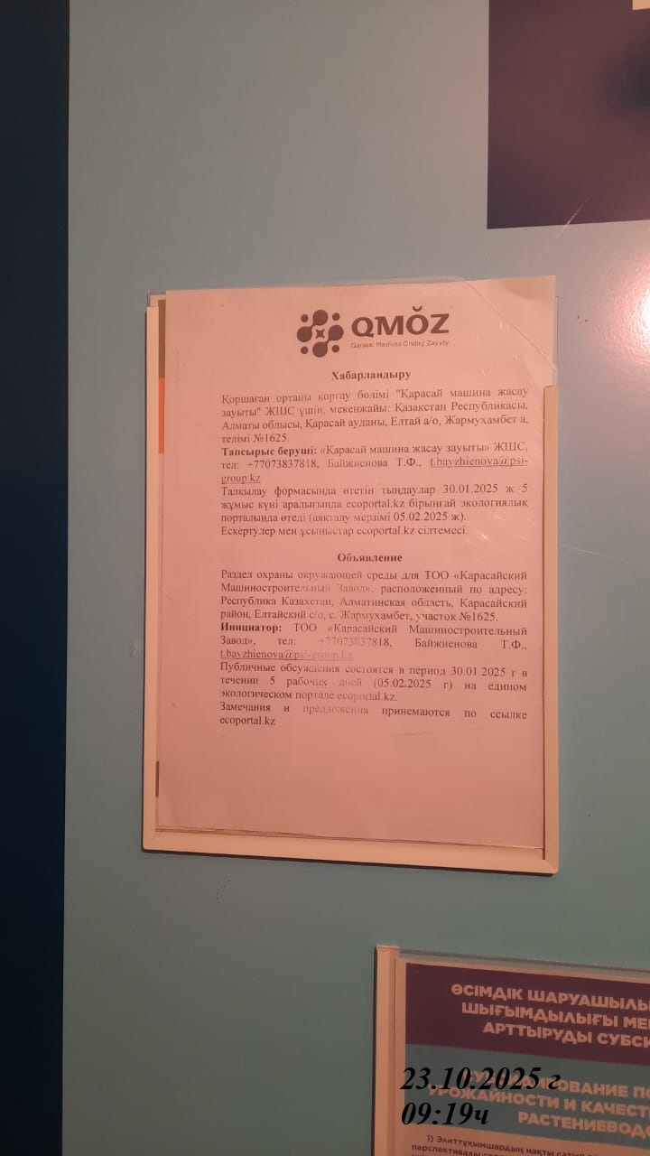 По проекту: Раздел Охраны окружающей среды для ТОО «Карасайский Машиностроительный Завод», расположенный по адресу: Алматинская область, Карасайский район, Елтайский с/о, с. Жармухамбет, участок №1625