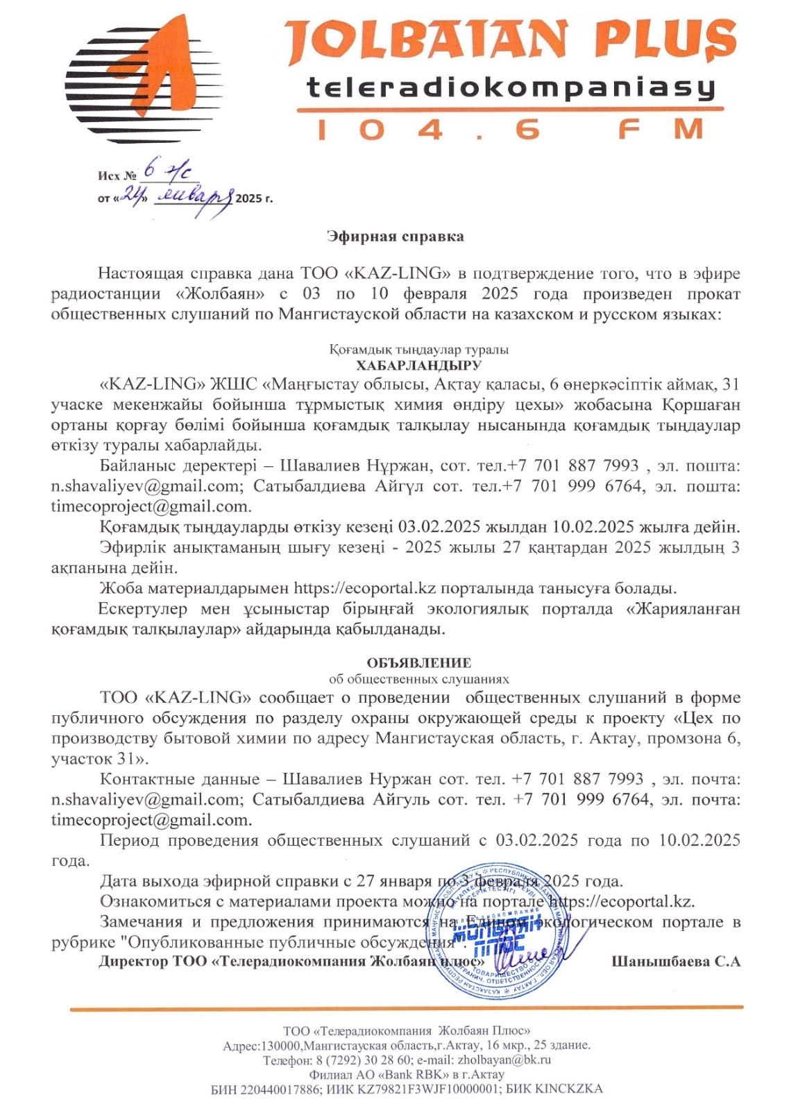 1. Инициатор: """Kaz-Ling"" жауапкершілігі шектеулі серіктестігі"