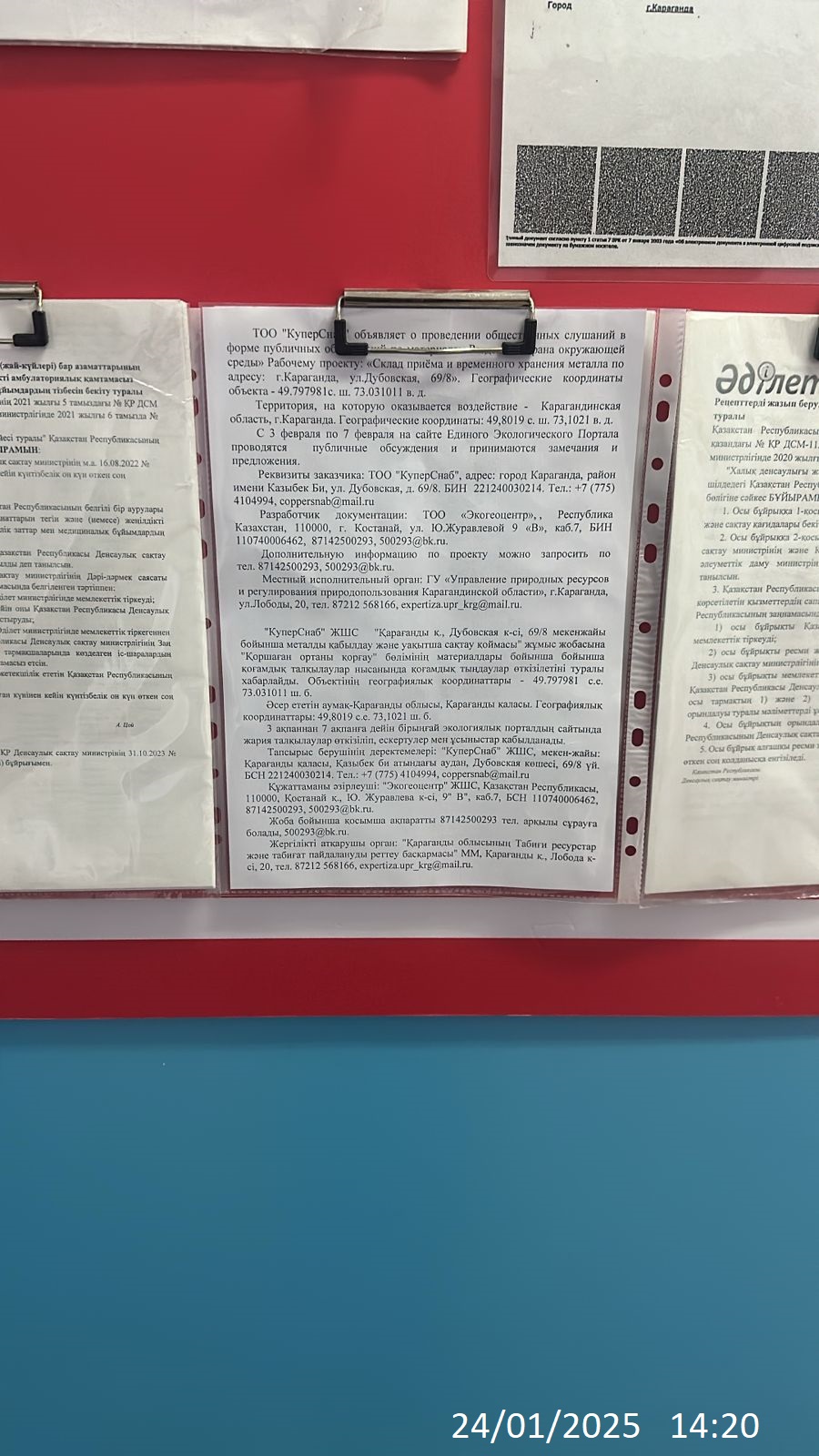 По проекту: Раздел «Охрана окружающей среды» к Рабочему проекту: «Склад приёма и временного хранения металла по адресу: г.Караганда, ул.Дубовская, 69/8»