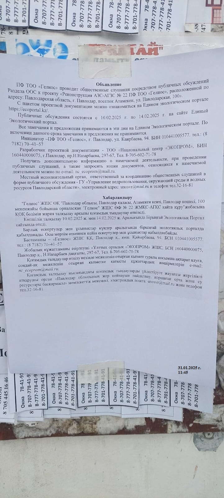 1.3. Контакты:ecology_pvl@helios.kz; ;