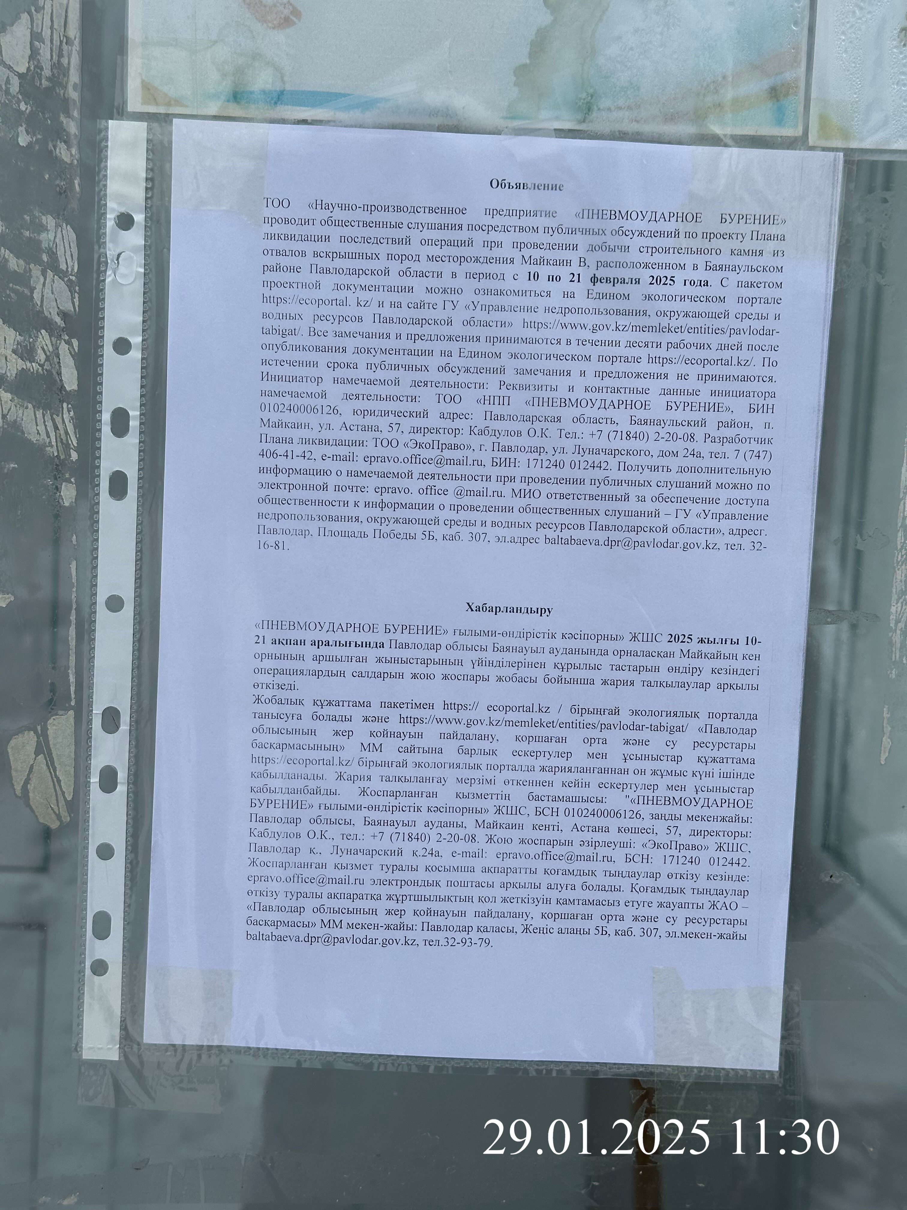 По проекту: План ликвидации последствий операций при проведении добычи строительного камня из отвалов вскрышных пород месторождения Майкаин В, расположенном в Баянаульском районе Павлодарской области