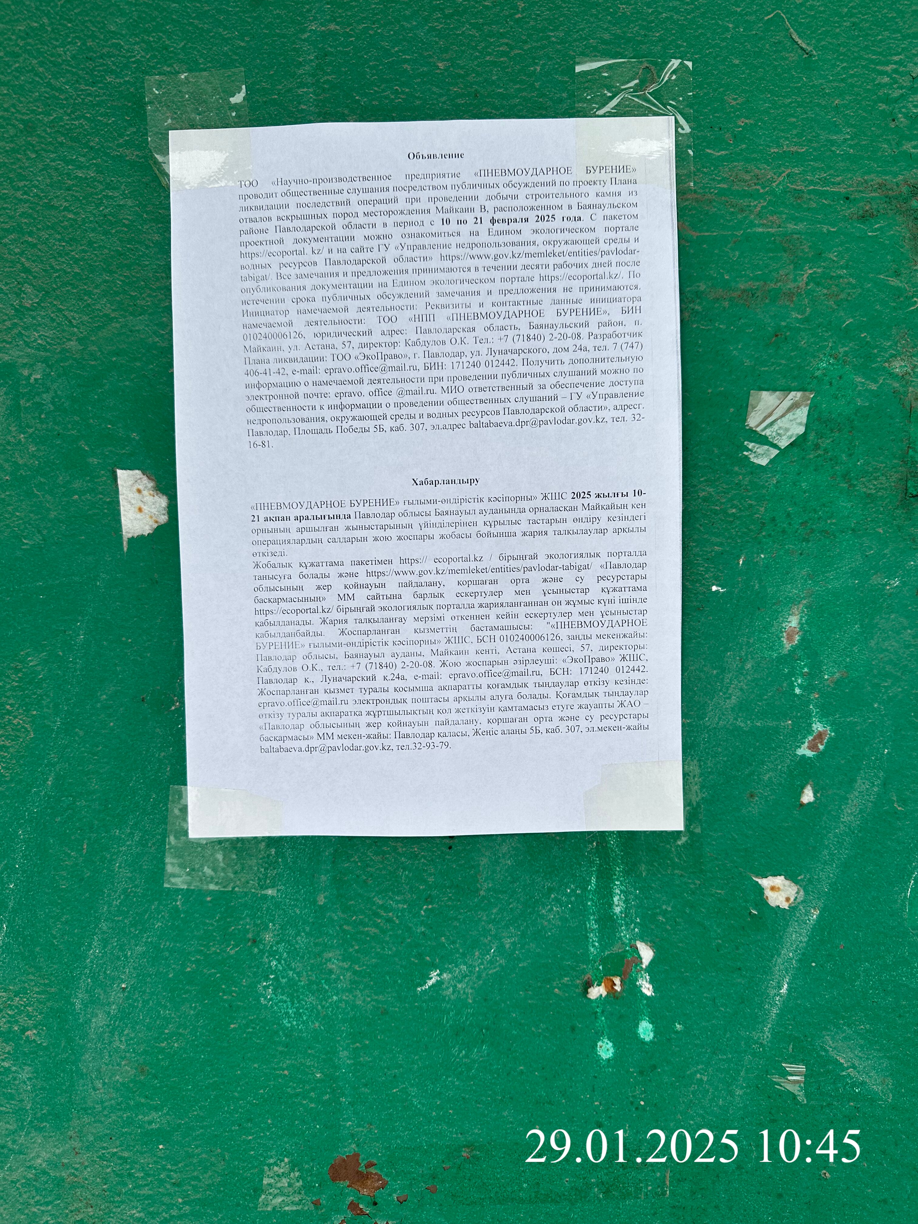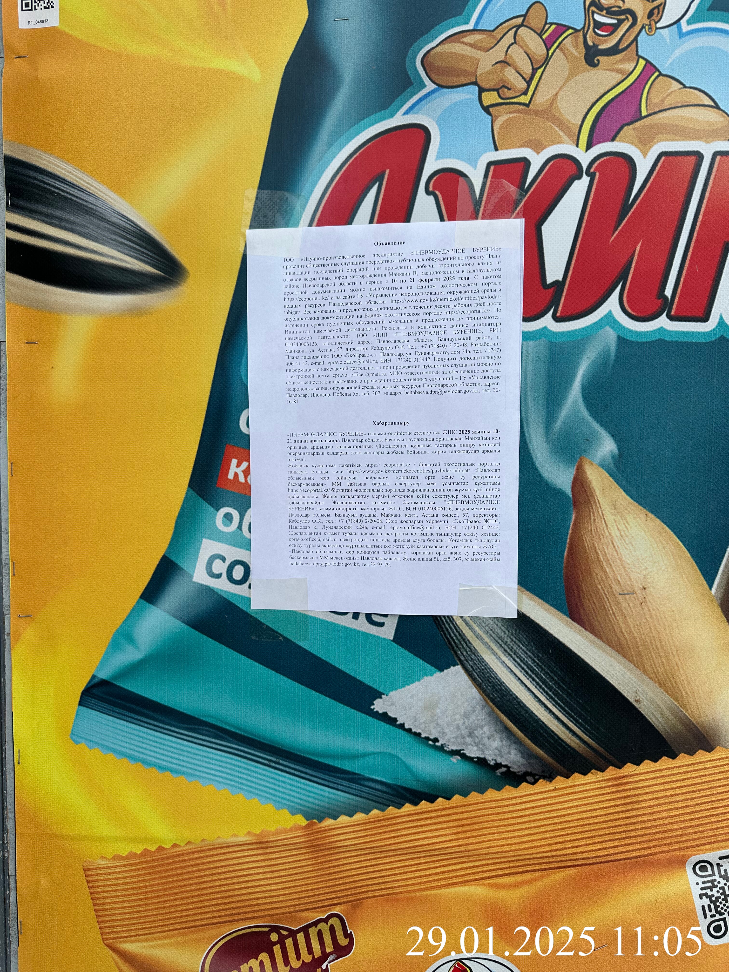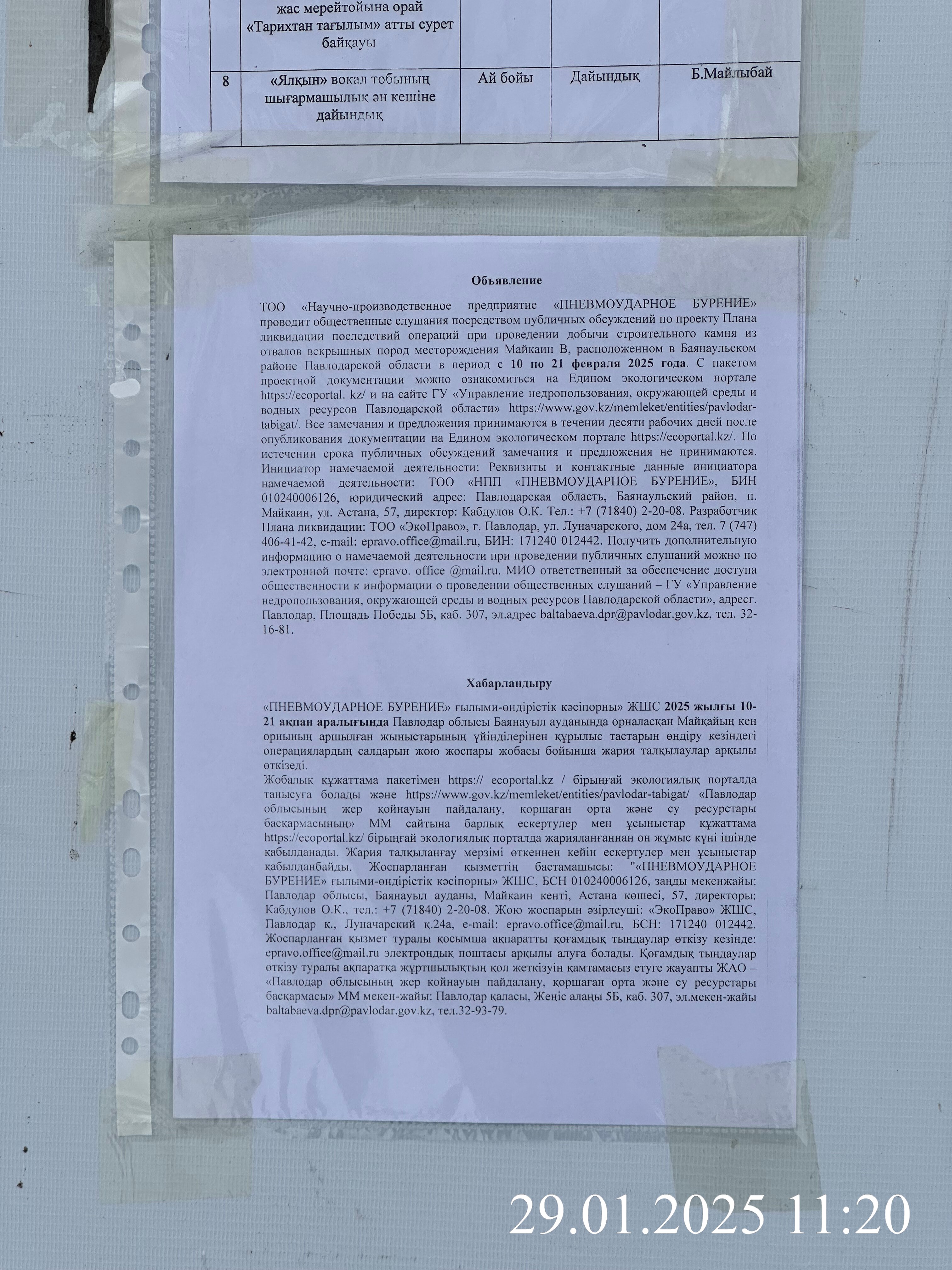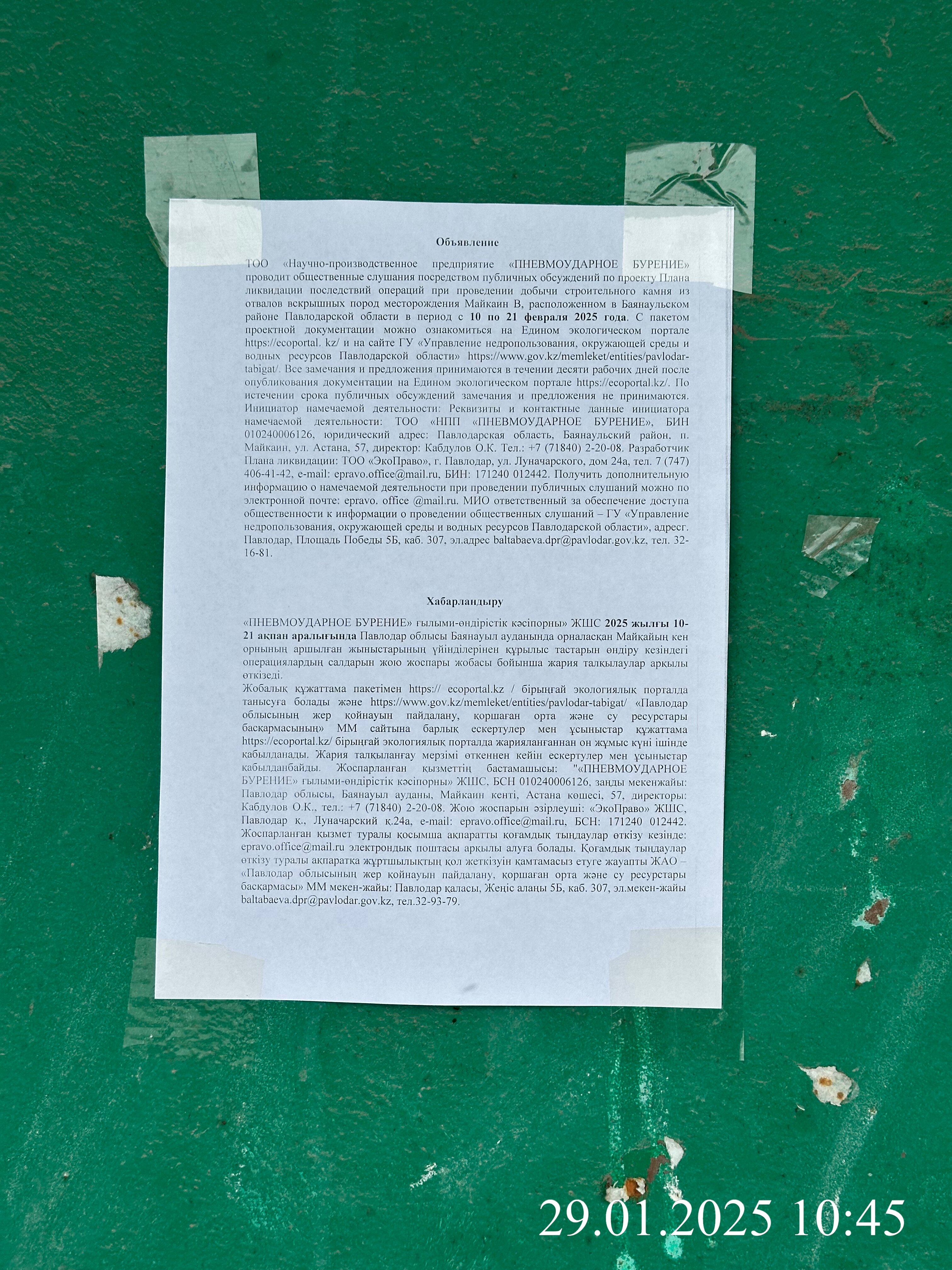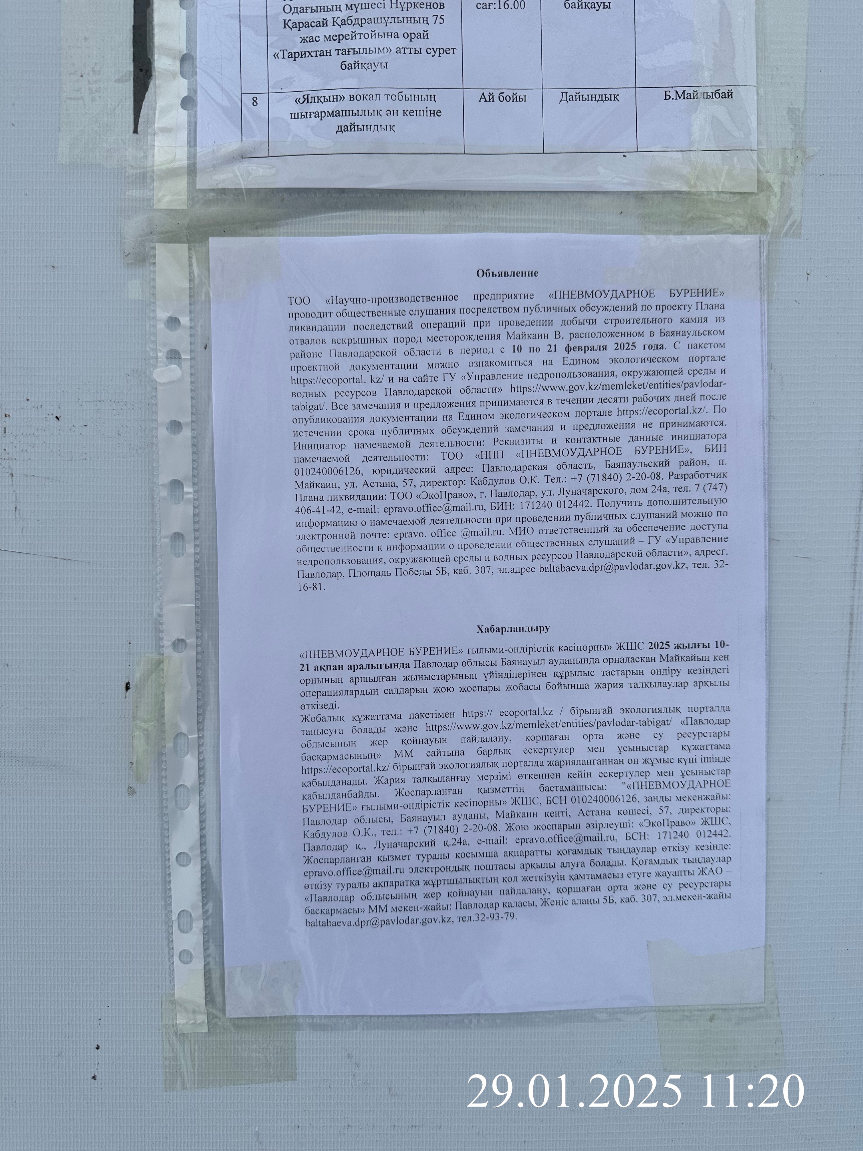 | 1 | Павлодарская область, Баянаульский район, Майкаинская п.а. |