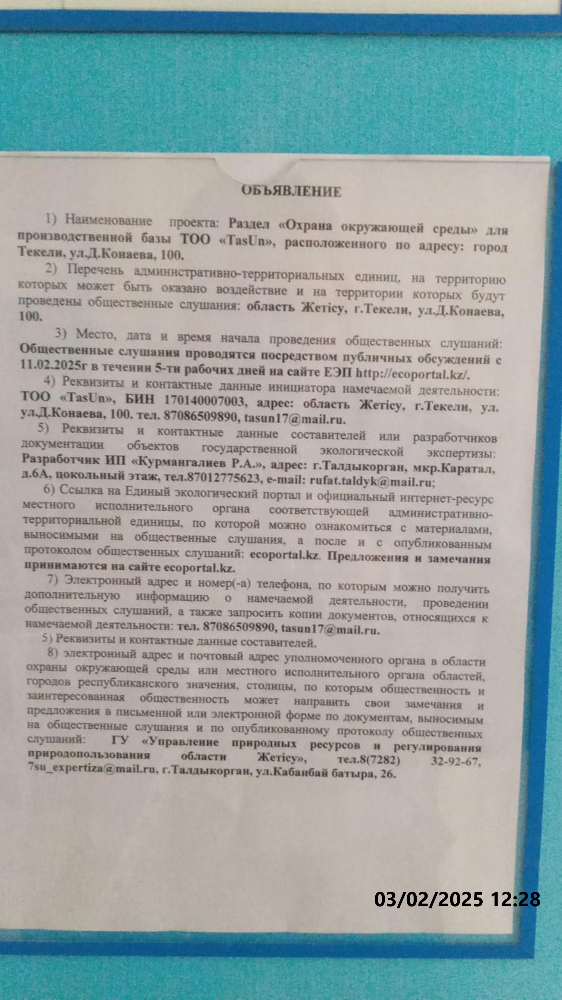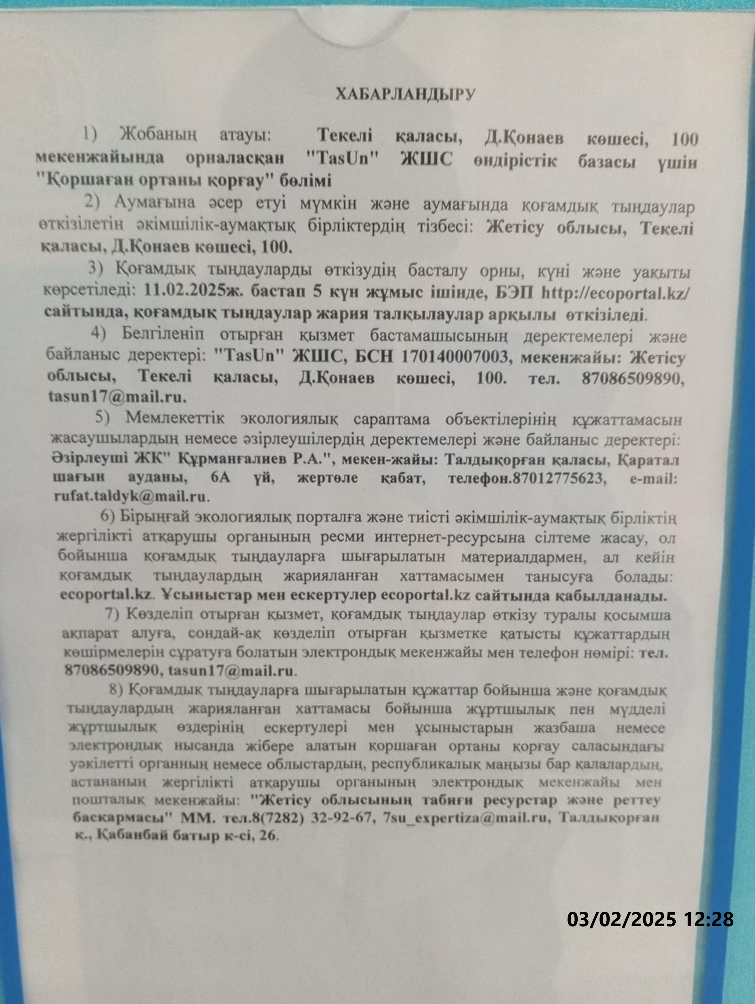 По проекту: Производственная база ТОО «TasUn», расположенного по адресу: город Текели, ул.Д.Конаева, 100