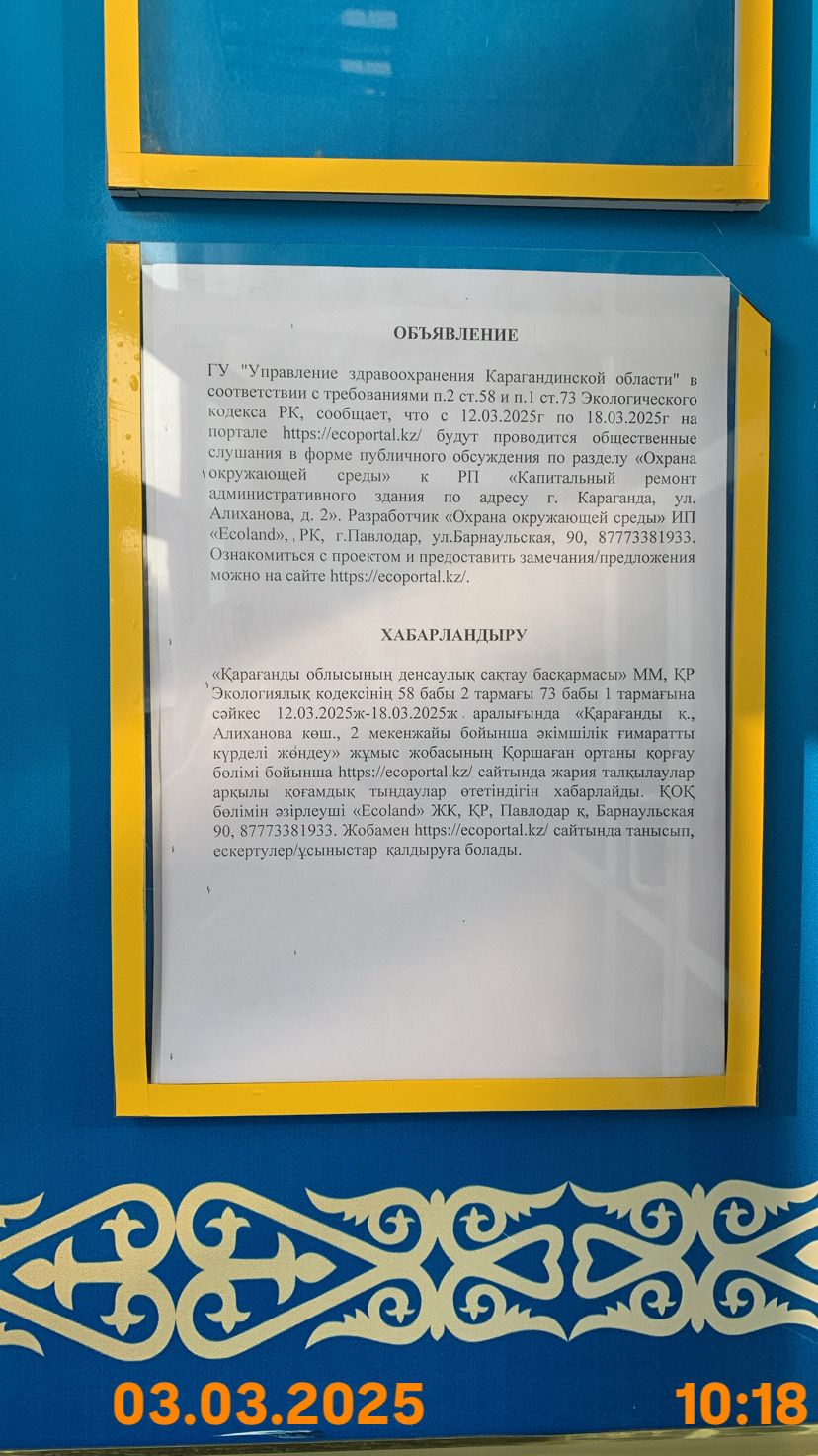 По проекту: РАЗДЕЛ ОХРАНА ОКРУЖАЮЩЕЙ СРЕДЫ к рабочему проекту «Капитальный ремонт административного здания по адресу г. Караганда, ул. Алиханова, д. 2»