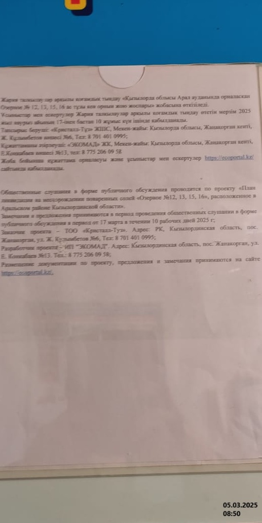 По проекту: План ликвидации на месторождении поваренных солей «Озерное №12, 13, 15, 16», расположенное в Аральском районе Кызылординской области