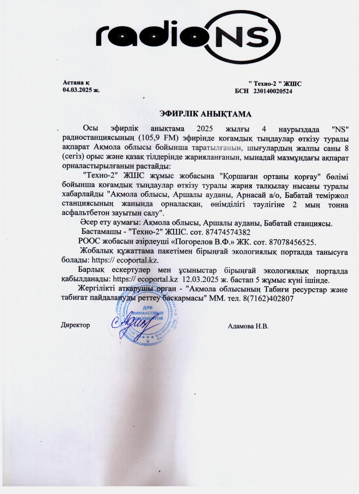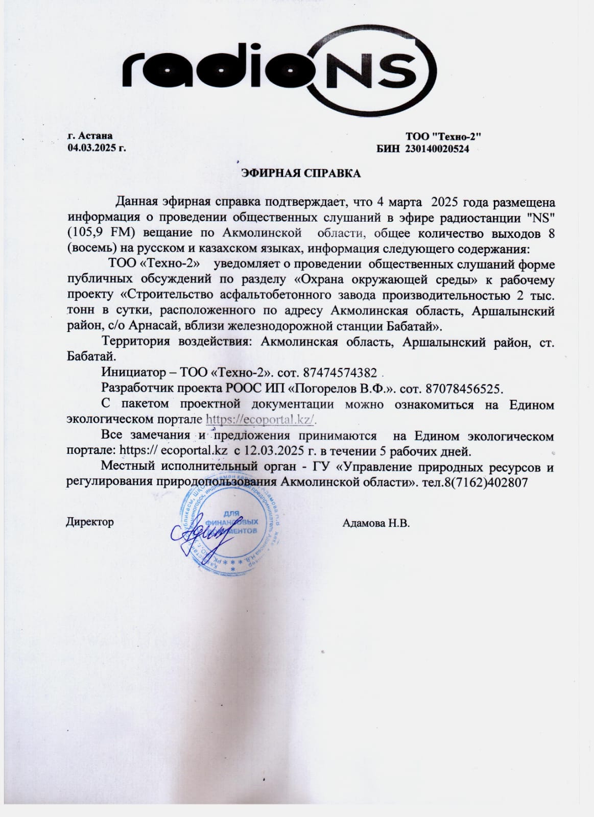 По проекту: Раздел «Охрана окружающей среды» к рабочему проекту «Строительство асфальтобетонного завода производительностью 2 тыс. тонн в сутки, расположенного по адресу Акмолинская область, Аршалынский район, с/о Арнасай, вблизи железнодорожной станции Бабатай»»