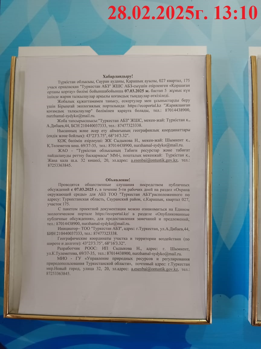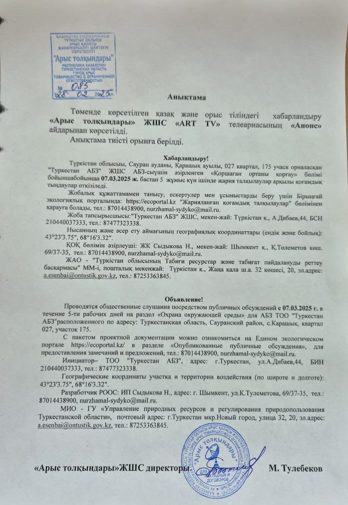 По проекту: Раздел «Охрана окружающей среды» для АБЗ ТОО "Туркестан АБЗ" расположенного по адресу: Туркестанская область, Сауранский район, с.Карашык, квартал 027, участок 175.