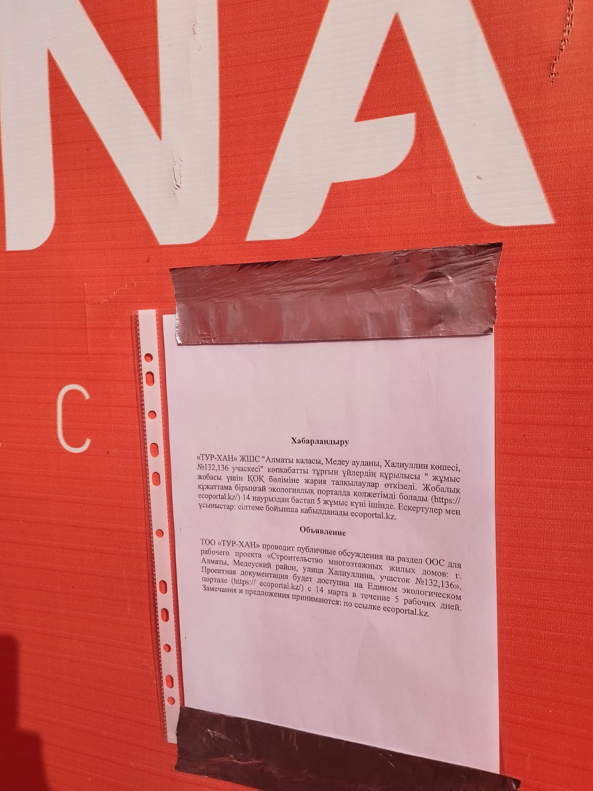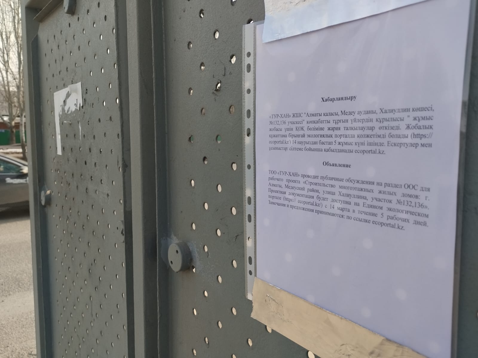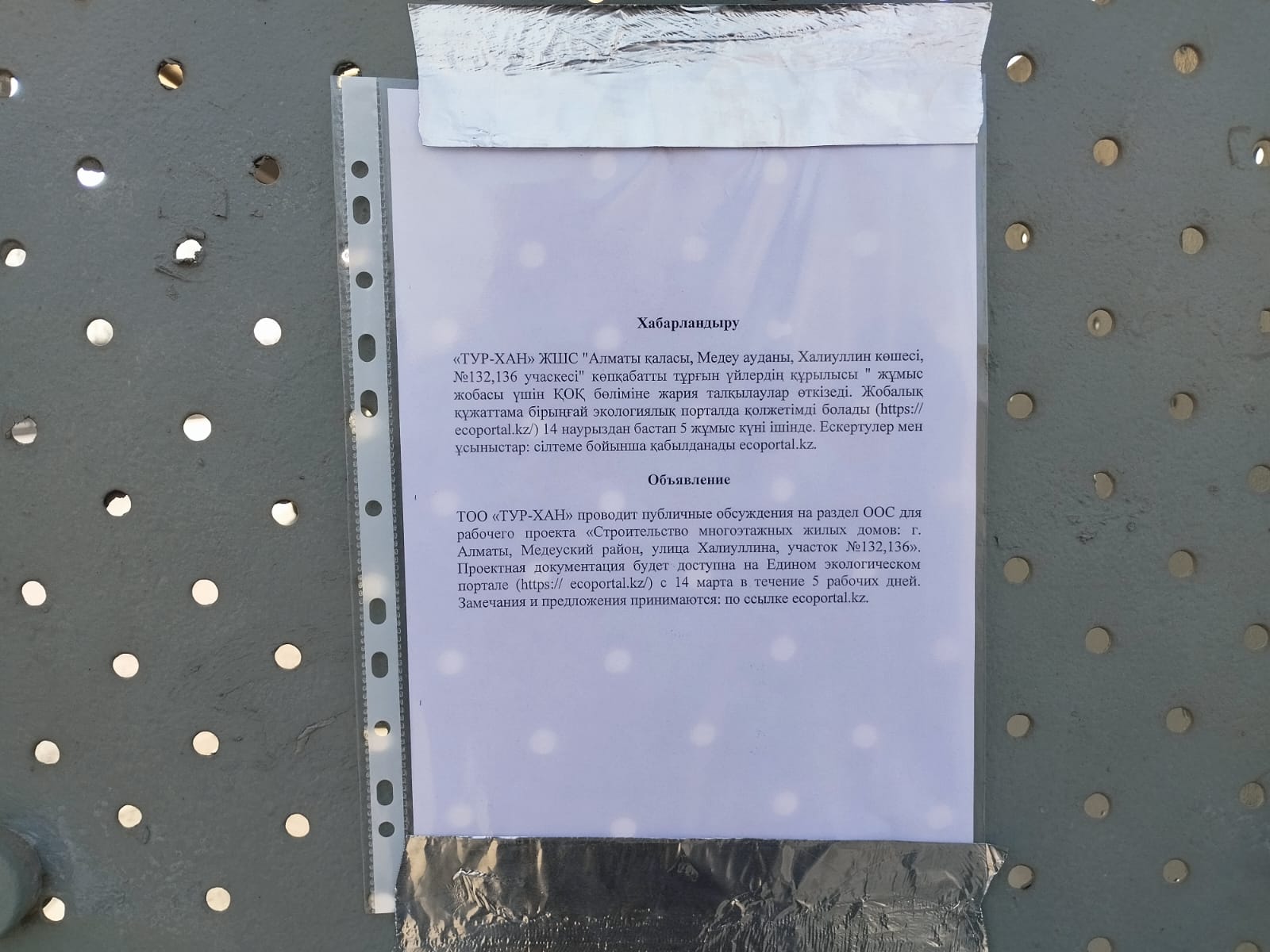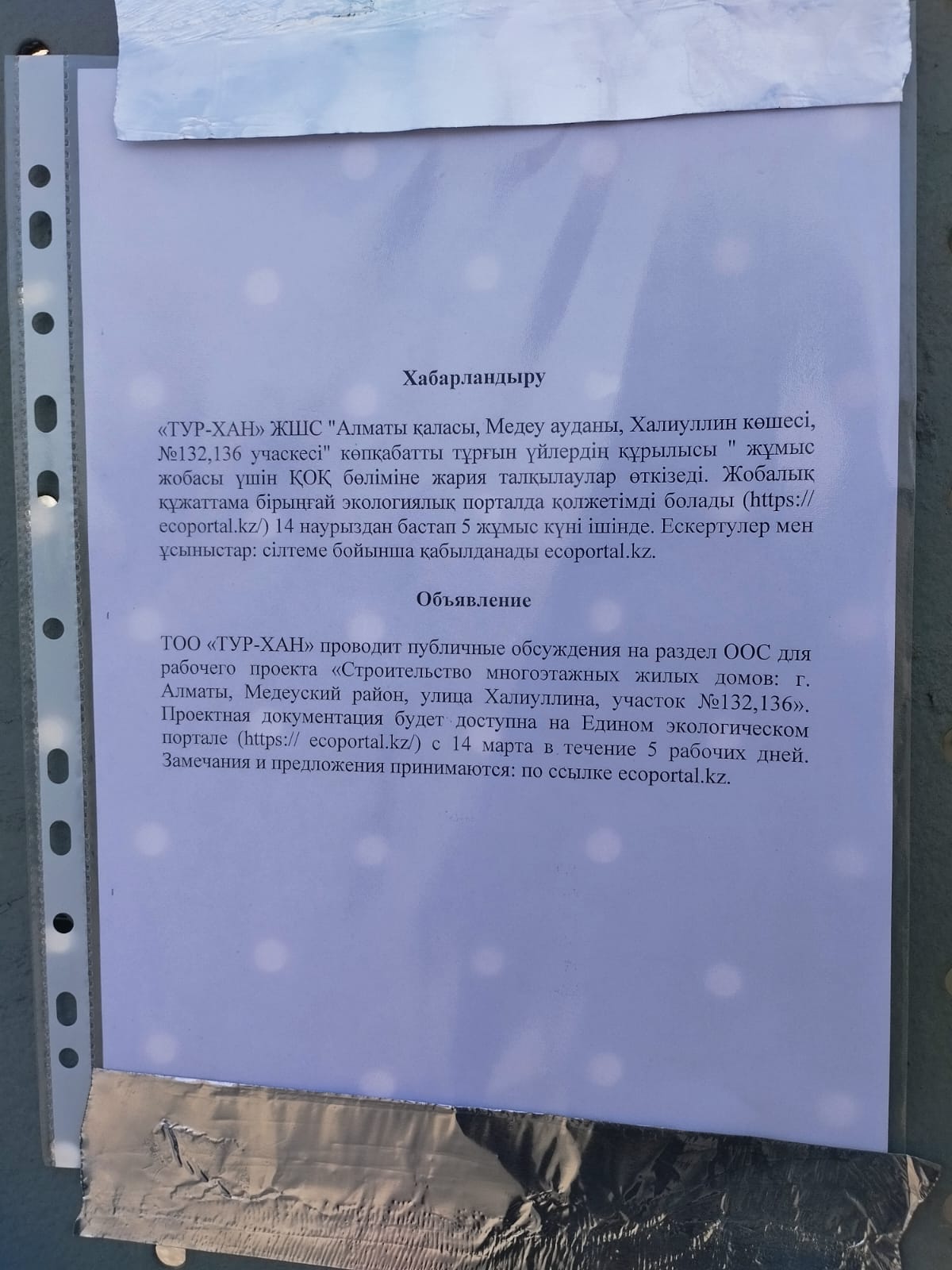 По проекту: «РООС» к проекту «Строительство многоэтажных жилых домов: г. Алматы, Медеуский район, улица Халиуллина, участок №132,136»