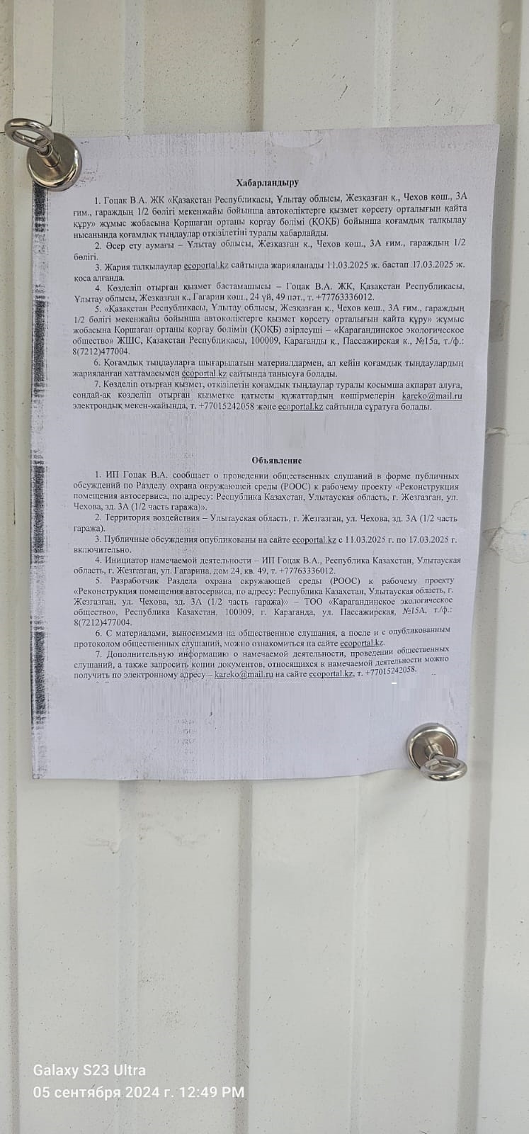 По проекту: РАЗДЕЛ ОХРАНА ОКРУЖАЮЩЕЙ СРЕДЫ (РООС) к рабочему проекту Реконструкция помещения автосервиса Адрес объекта: Республика Казахстан, Улытауская область, г. Жезказган, ул. Чехова, зд. 3А (1/2 часть гаража)