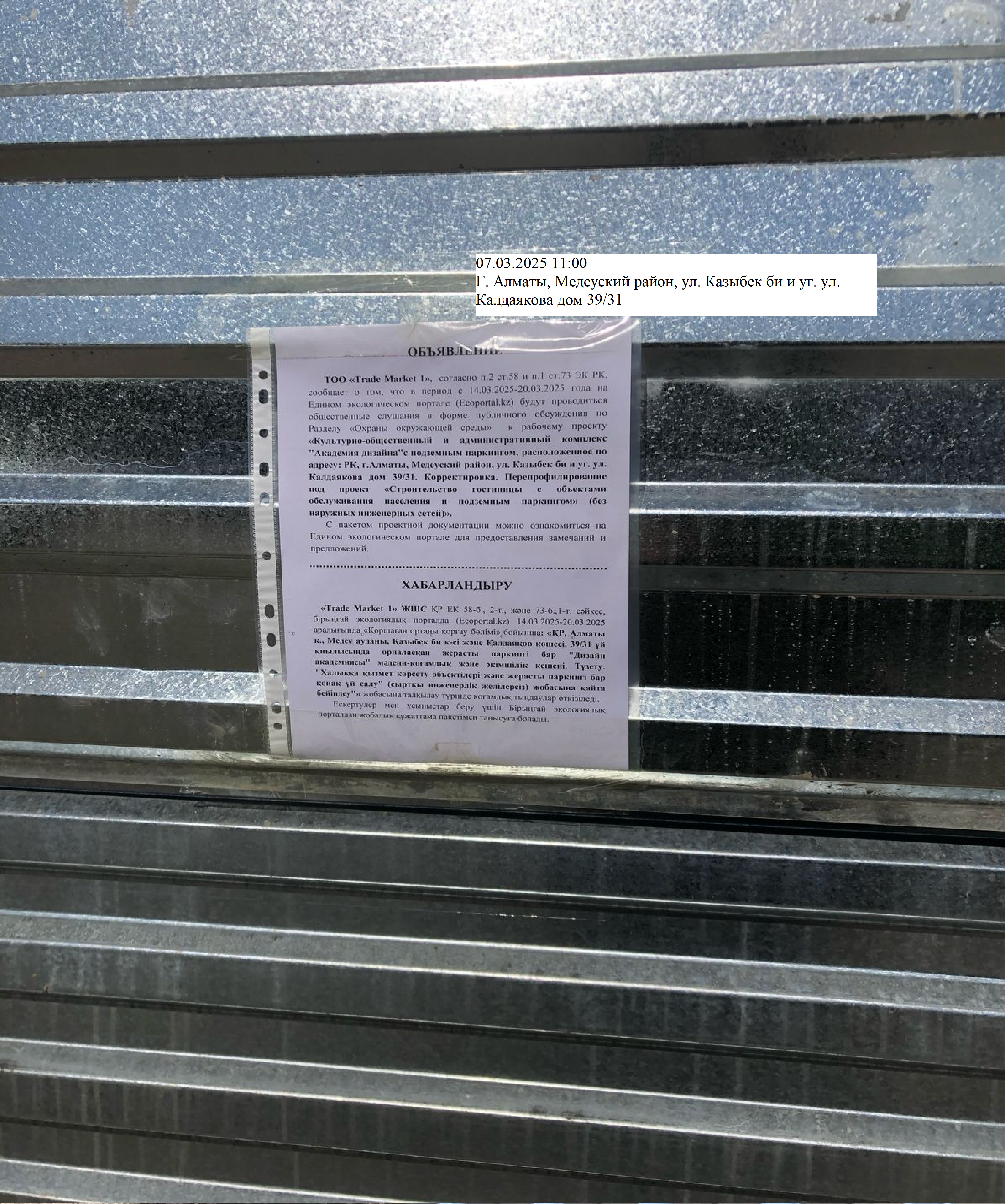 По проекту: Раздел «Охрана окружающей среды» к рабочему проекту «Культурно- общественный и административный комплекс "Академия дизайна"c подземным паркингом, расположенное по адресу: РК, г.Алматы, Медеуский район, ул. Казыбек би и уг. ул. Калдаякова дом 39/31. Корректировка. Перепрофилирование под проект «Строительство гостиницы с объектами обслуживания населения и подземным паркингом» (без наружных инженерных сетей)»