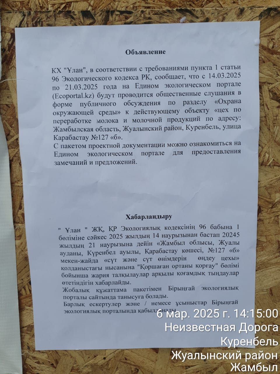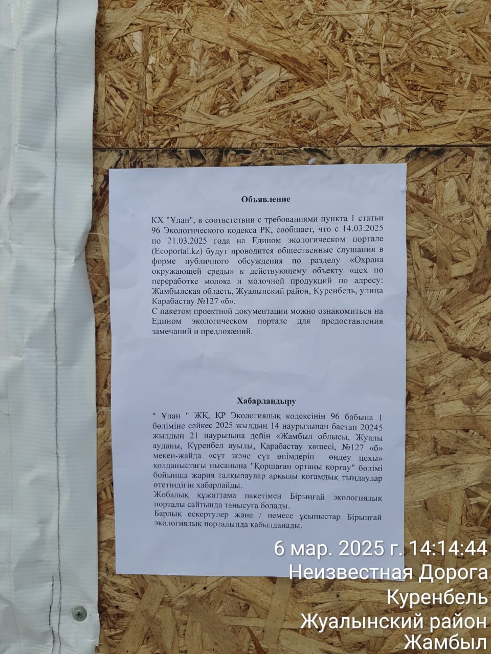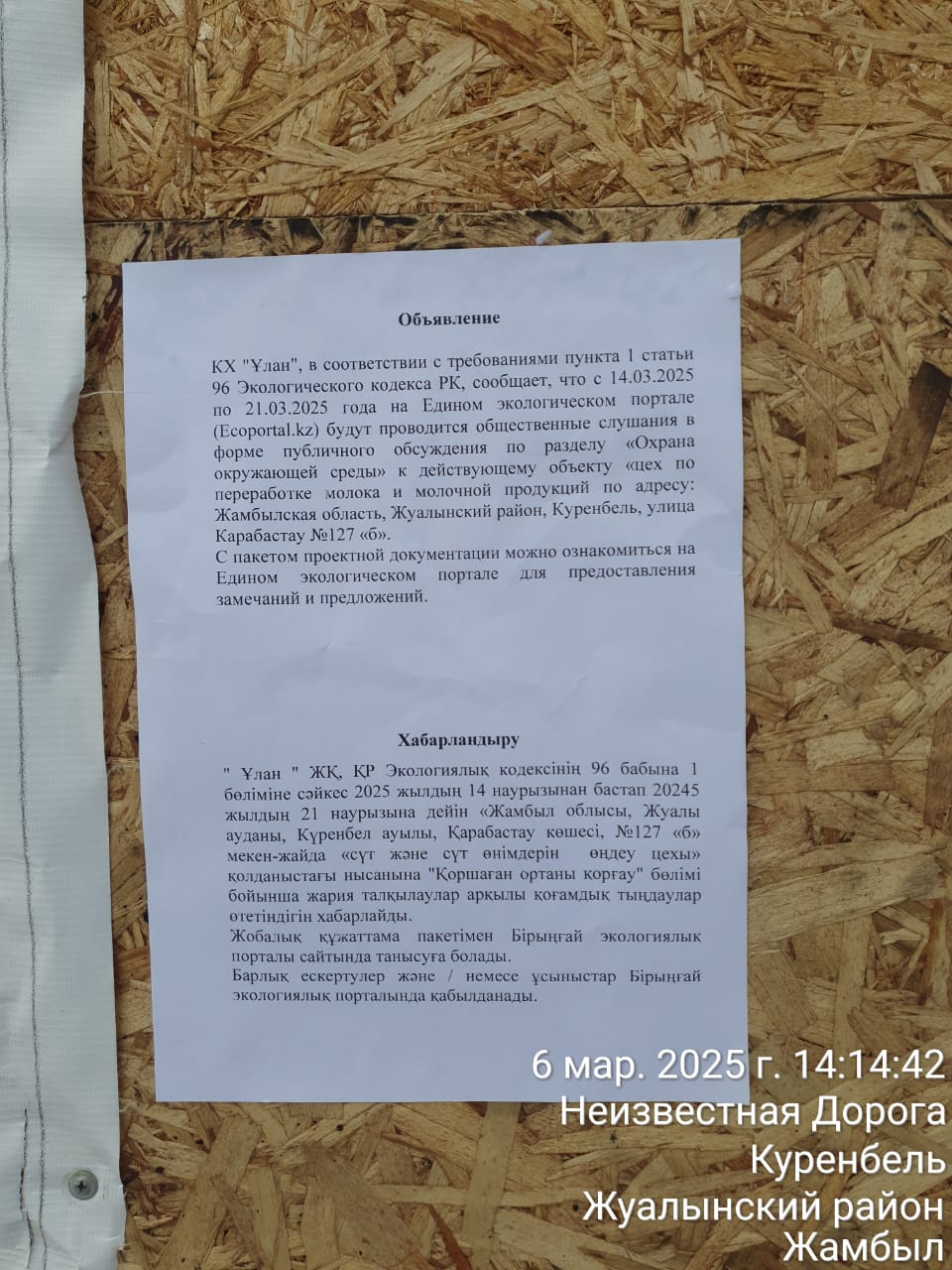 По проекту: Раздел «Охрана окружающей среды» к действующему объекту «цех по переработке молока и молочных продуктов КХ «Ұлан» расположенной пол адресу: Жамбылская область, Жуалынский район, Куренбель, улица Карабастау №127 «б».