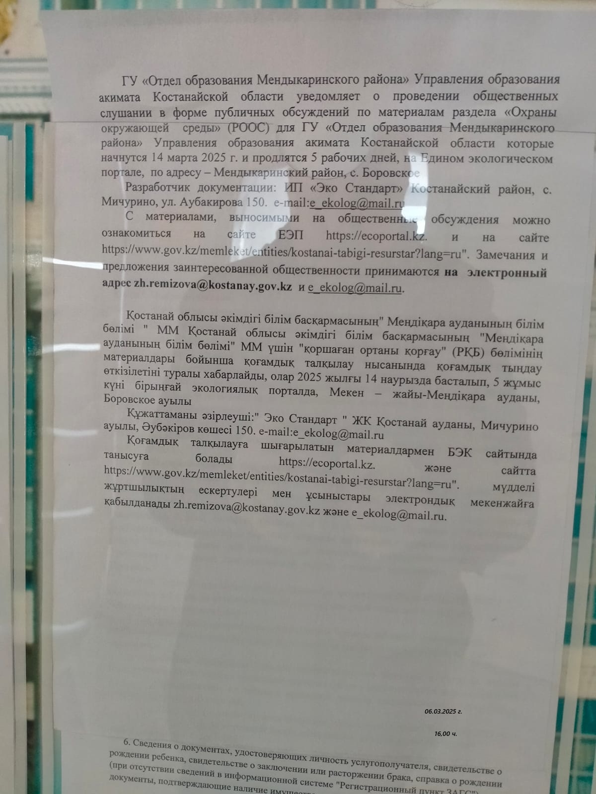 По проекту: Раздел охраны окружающей среды (РООС) ГУ «Отдел образования Мендыкаринского района» Управления образования акимата Костанайской области