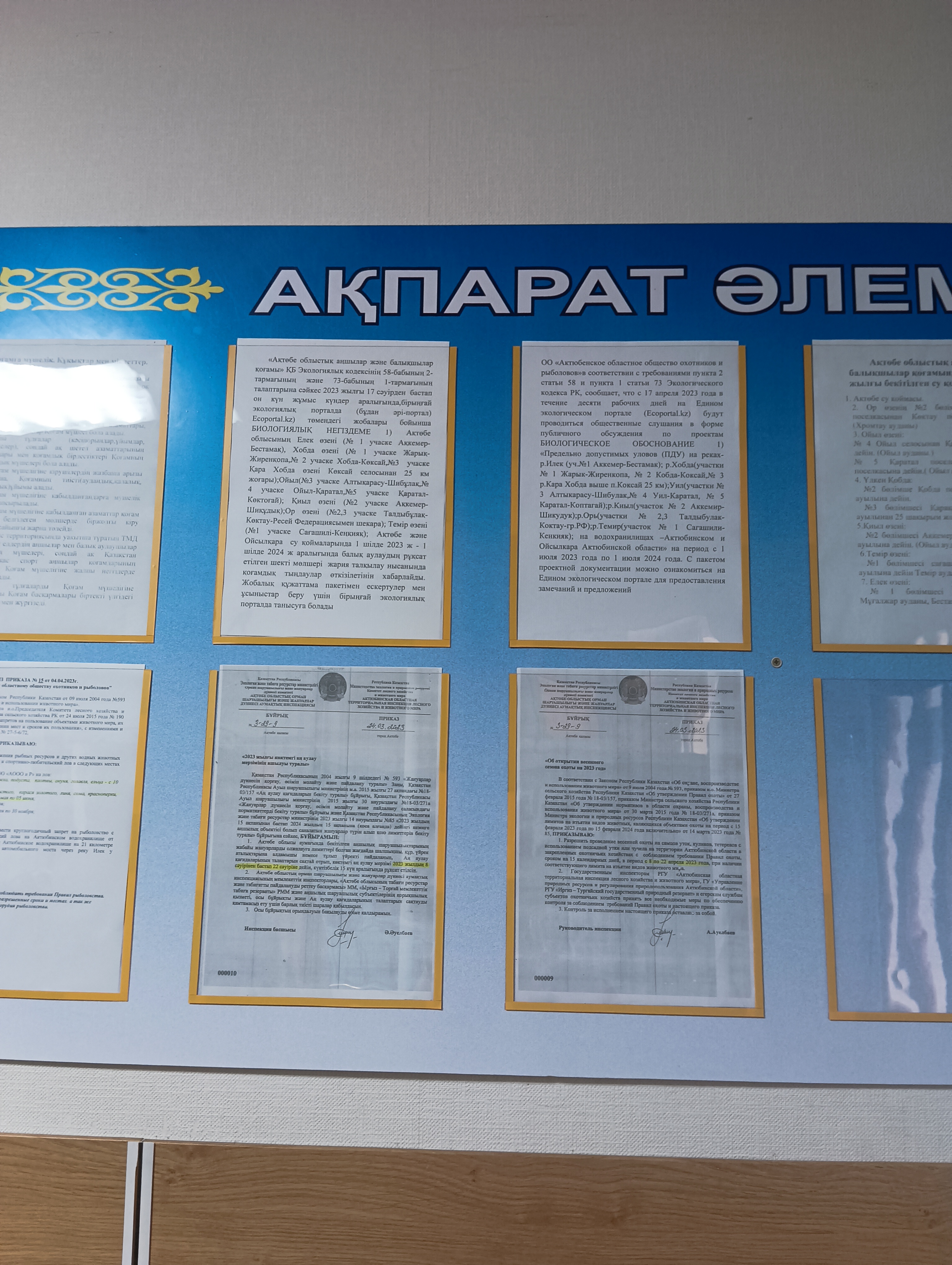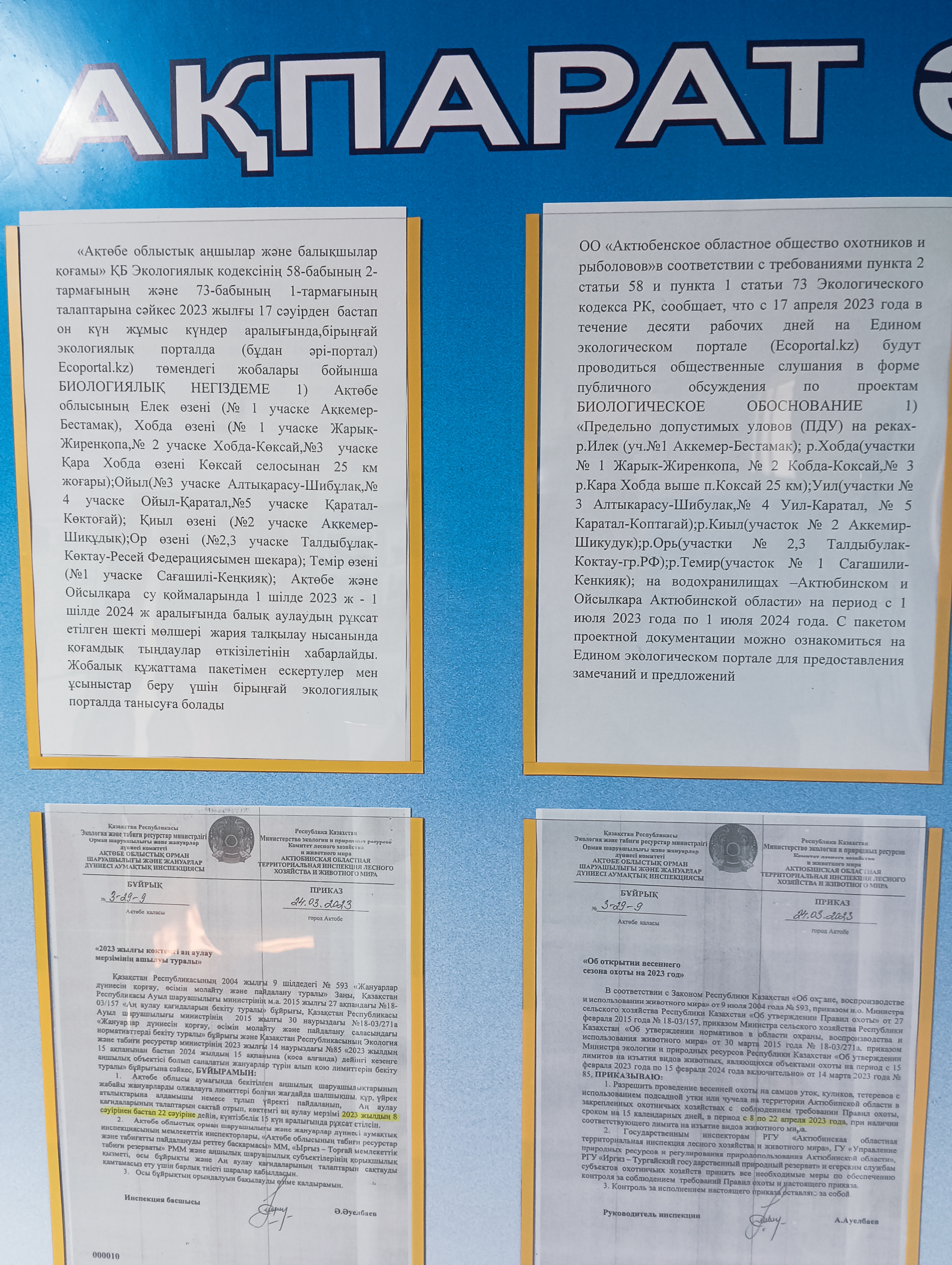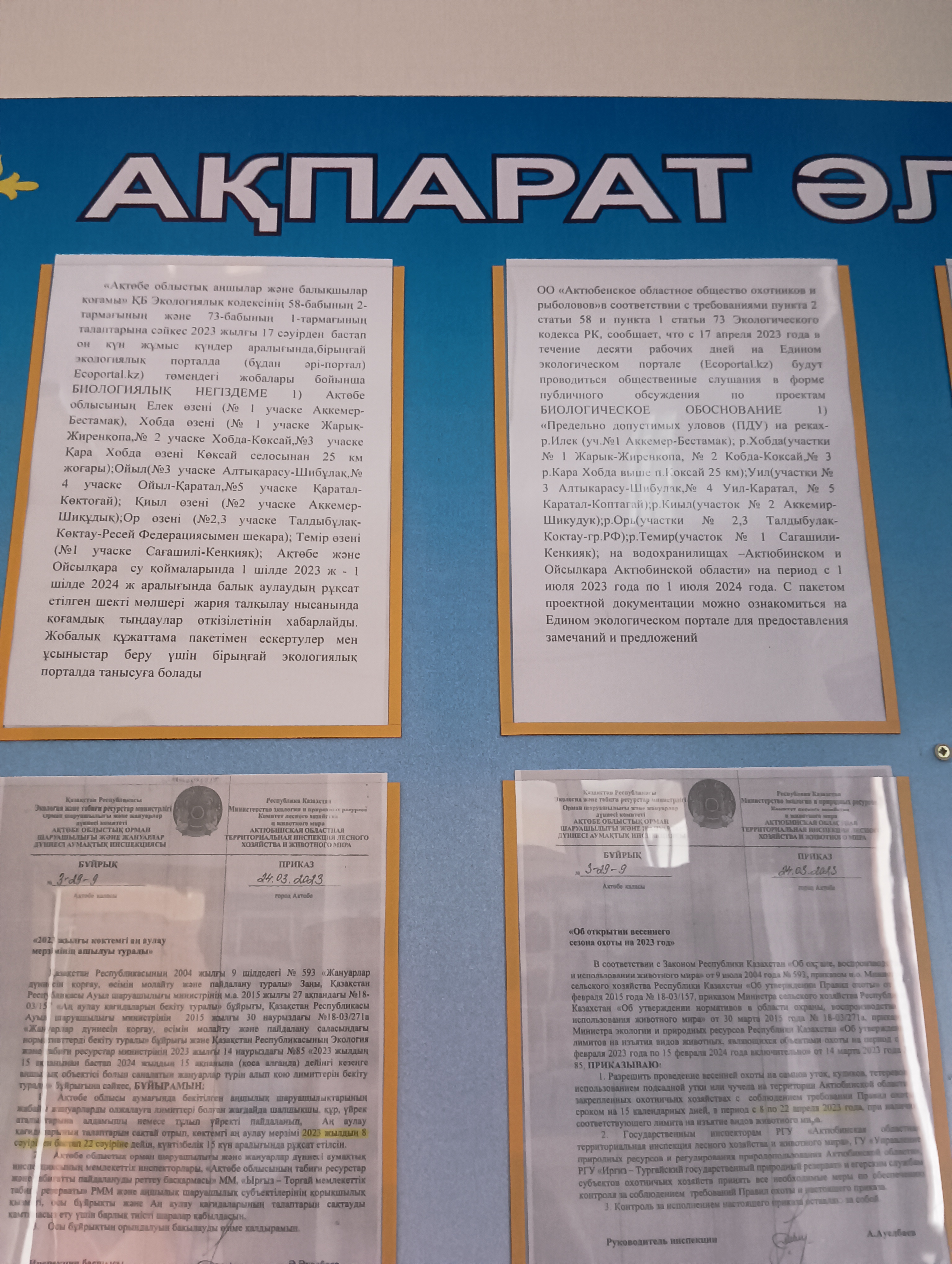 По проекту: БИОЛОГИЧЕСКОЕ ОБОСНОВАНИЕ Предельно допустимых уловов (ПДУ) на реках-р.Илек(уч.№1 Аккемер-Бестамак); р.Хобда(участки № 1 Жарык-Жиренкопа,№ 2 Кобда-Коксай,№ 3р.Кара Хобда выше п.Коксай 25 км);Уил(участки № 3 Алтыкарасу-Шибулак,№ 4 Уил-Каратал, № 5 Каратал-Коптагай);Киыл(участок № 2 Аккемир-Шикудук);р.Орь(участки № 2,3 Талдыбулак-Коктау-гр.РФ);Темир(участок № 1 Сагашили-Кенкияк); на водохранилищах –Актюбинском и Ойсылкара на период с 1 июля 2023 по 1 июля 2024 года