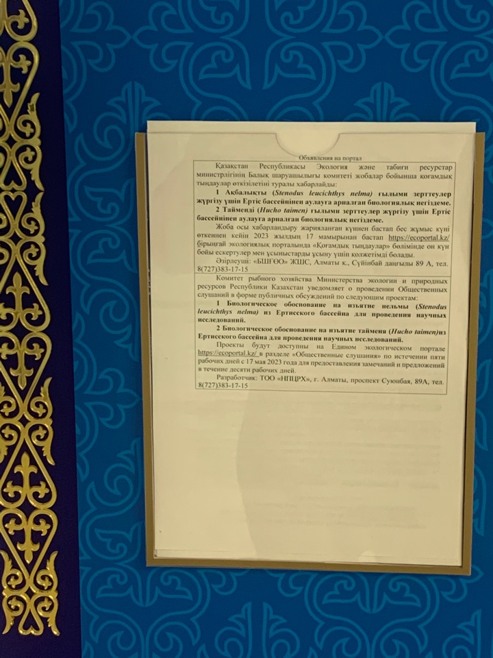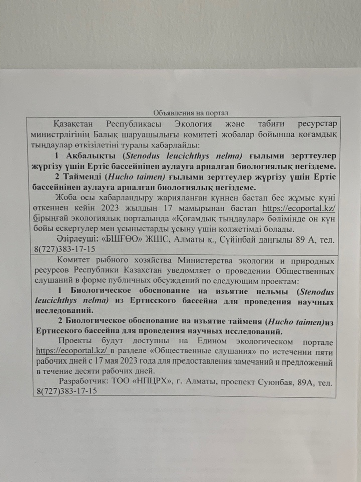 По проекту: БИОЛОГИЧЕСКОЕ ОБОСНОВАНИЕ на изъятие нельмы (Stenodus leucichthys nelma) из Ертисского бассейна для проведения научных исследований (доместикация, формирование ремонтного стада и ее последующее искусственное воспроизводство) с 01 марта 2024 года по 30 октября 2026 года