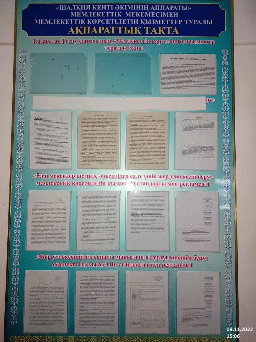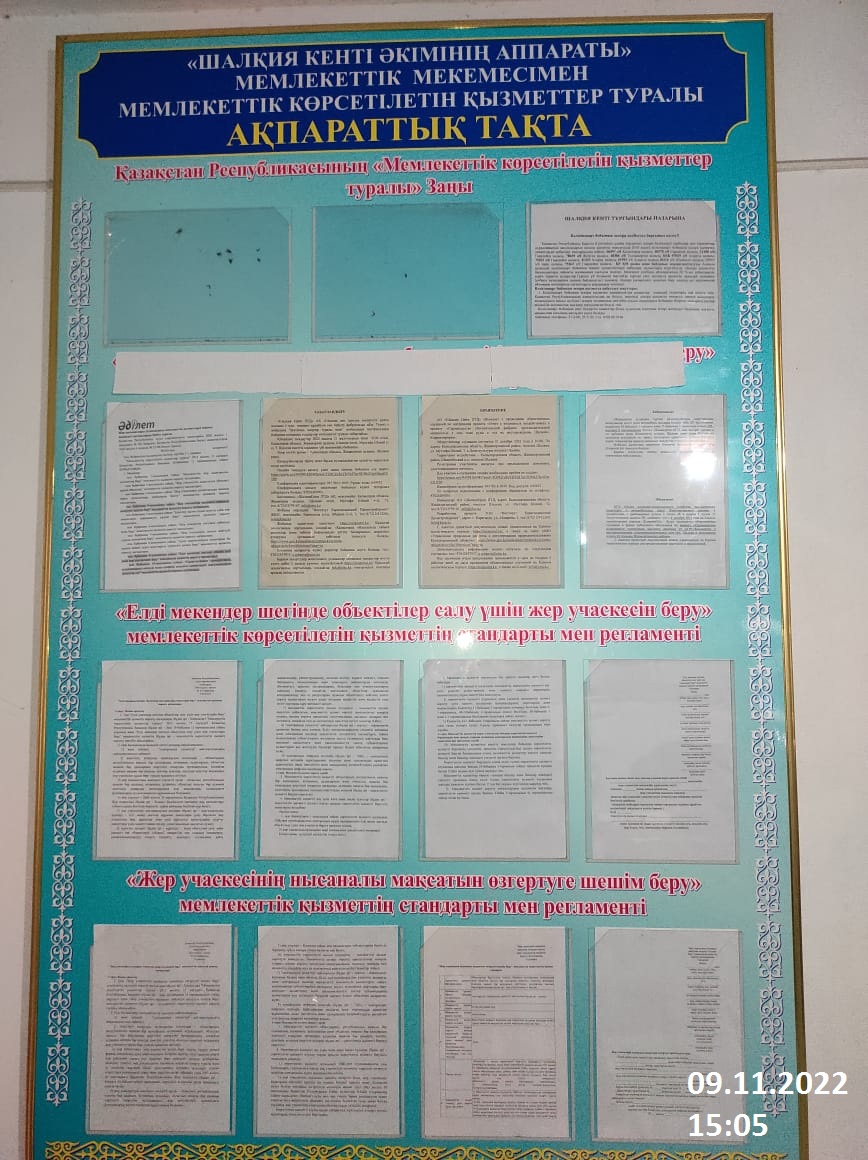 6.3. расположение мест, специально предназначенных для Размещения печатных объявлений (доски объявлений): доска объявлений акимата поселка Шалкия, доска объявлений в селе Құттықожа и поселке Жанақорған