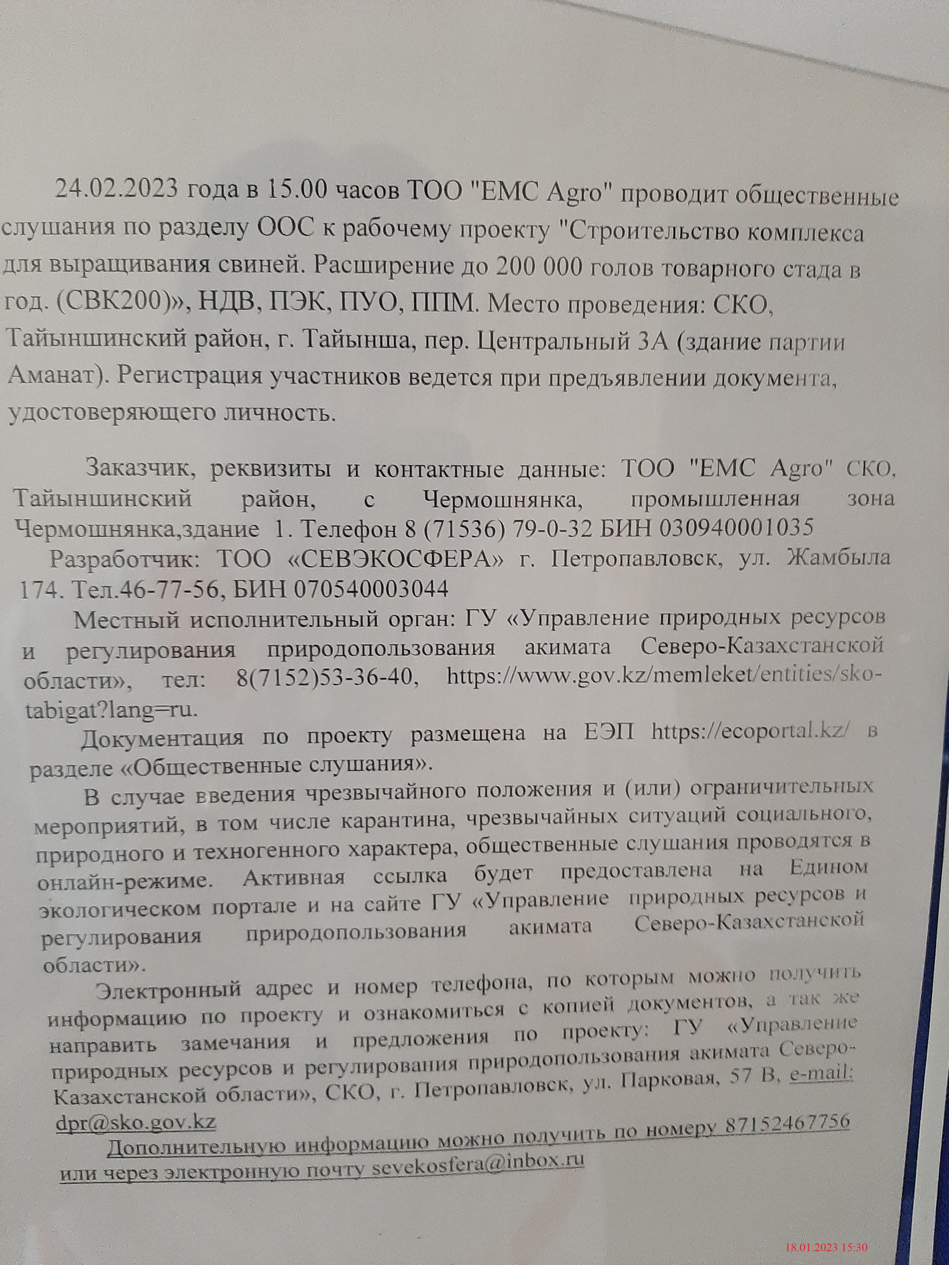 3. Общественные слушания организованны: Управление природных ресурсов и регулирования природопользования Северо-Казахстанской области, e.aitzhanov@sko.gov.kz,