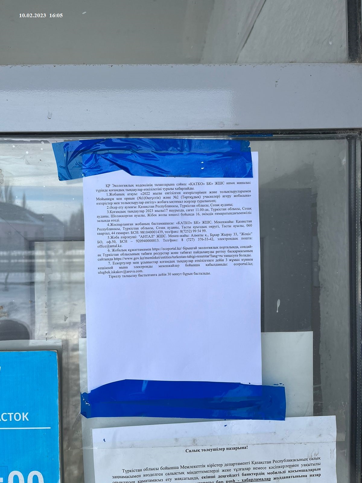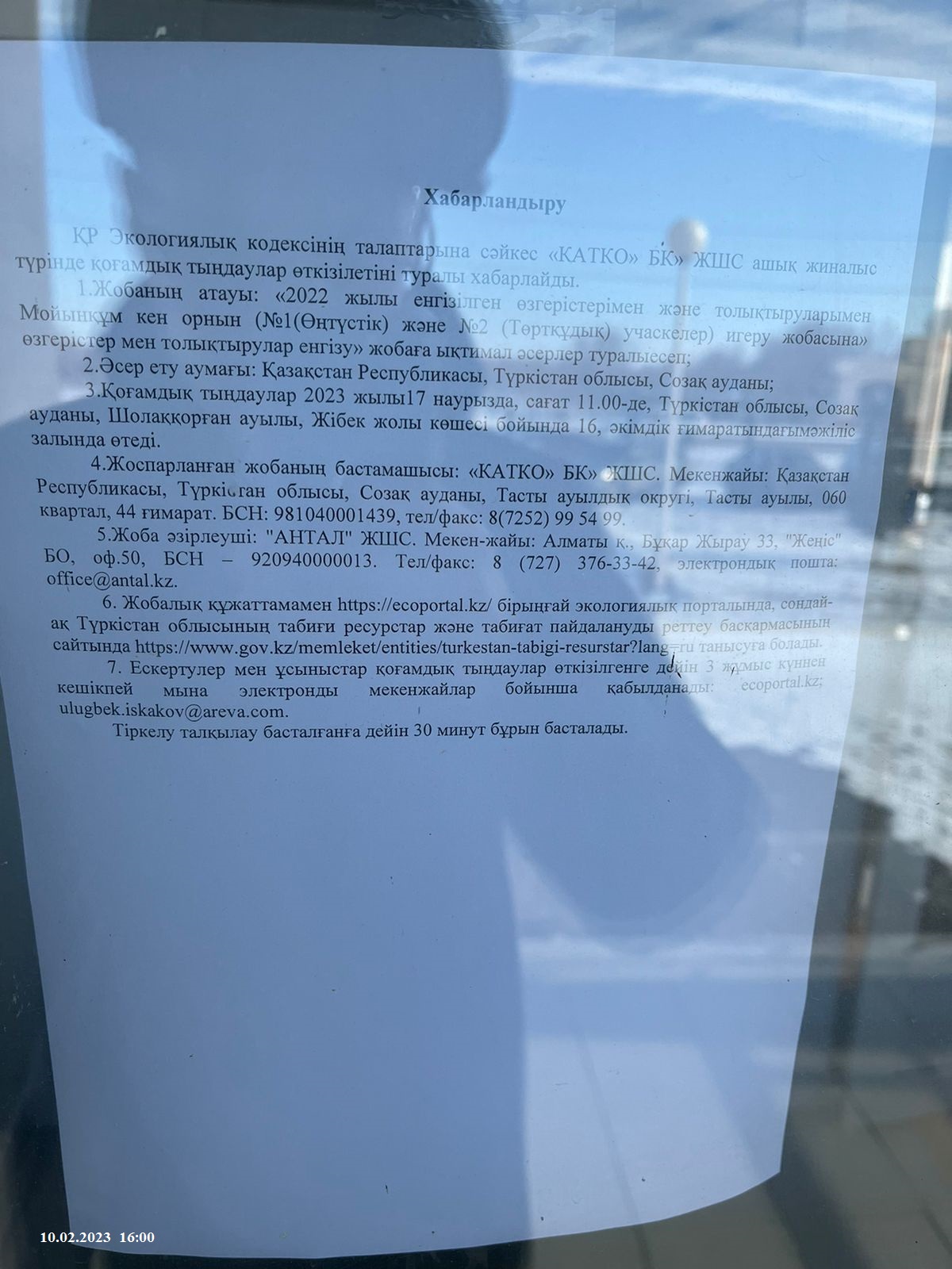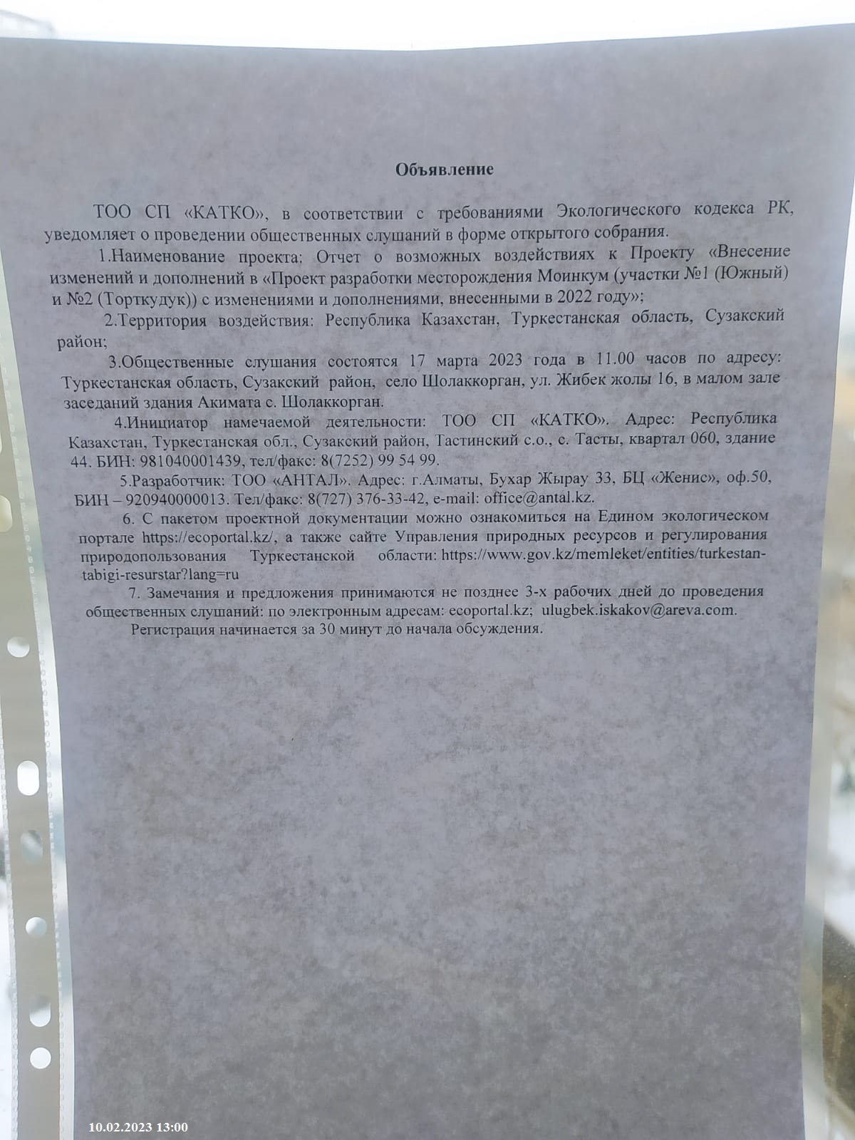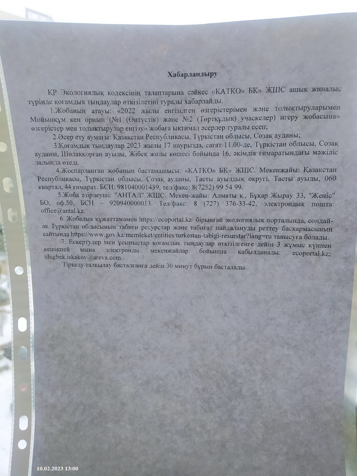 3. Общественные слушания организованны: Управление природных ресурсов и регулирования природопользования Туркестанской области, a.shymabekova@ontustik.gov.kz,