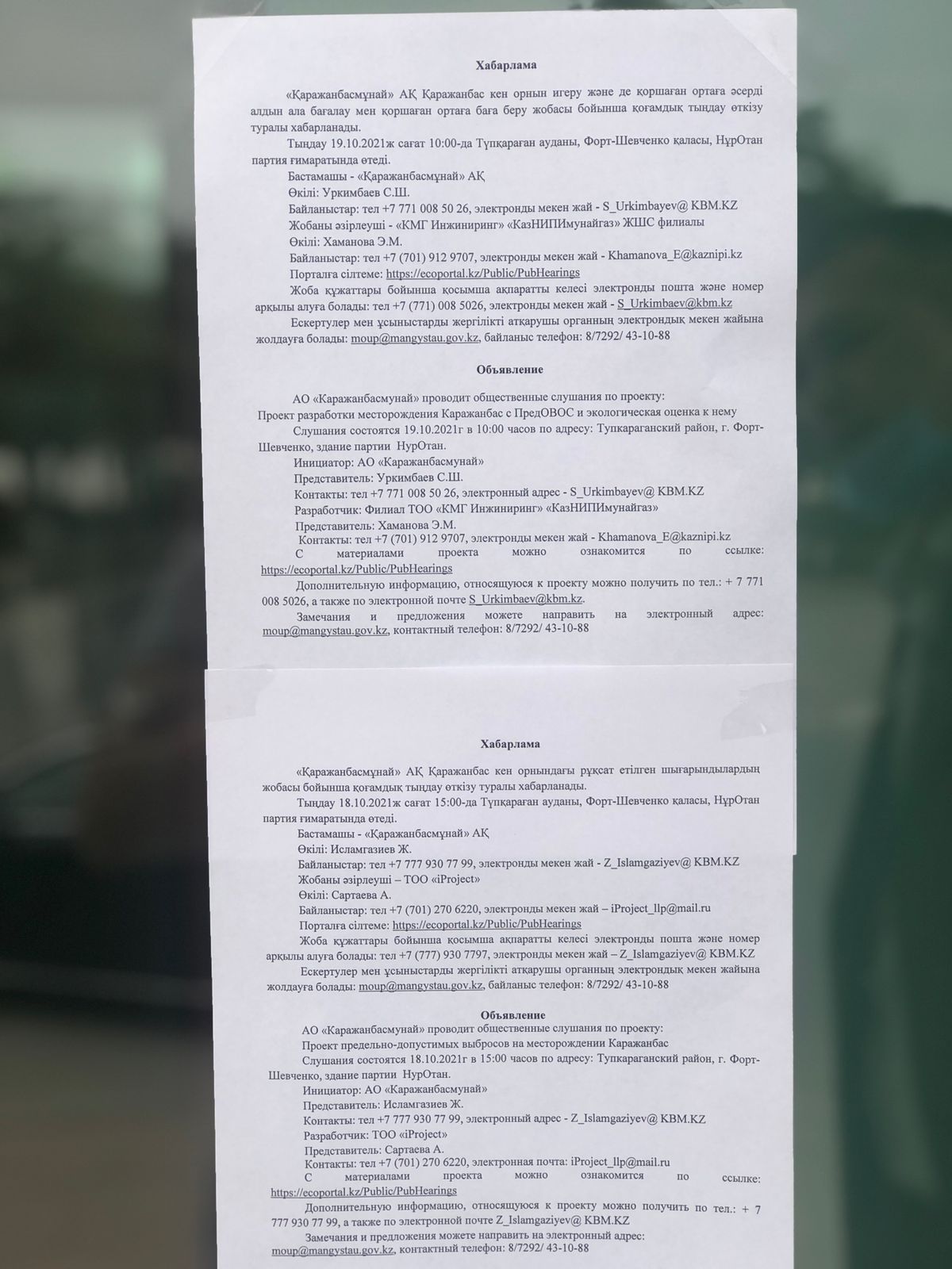 3. Общественные слушания организованны: Управление природных ресурсов и регулирования природопользования Мангистауской области, g.tulembet@mangystau.gov.kz,