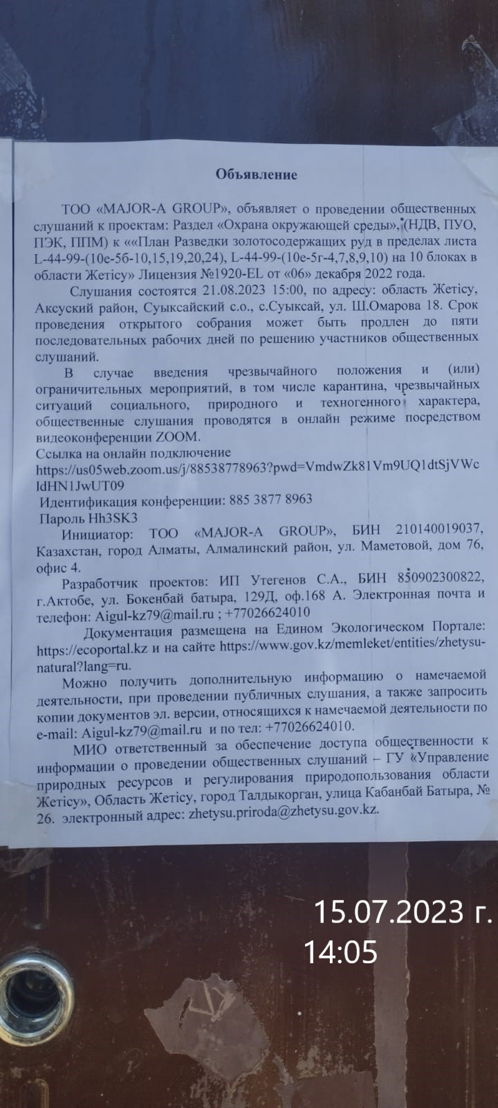 5.4. Дополнительная информация о административно-территориальных единиц: Ближайщим населенным пунктом является село Баласаз. Однако администрация села находится в селе Суыксай в связи с чем слушания будут проводится в селе Суыксай с участием жителей села Баласаз. В случае ведения режима ЧС или карантина на территории РК, слушания будет проведена в формате видеоконференции, для принятия участия необходимо скачать приложение ZOOM Meeting Cloud. ссылка на видеоконференцию : https://us05web.zoom.us/j/88538778963?pwd=VmdwZk81Vm9UQ1dtSjVWcldHN1JwUT09 Идентификация конференции: 885 3877 8963 Пароль Hh3SK3