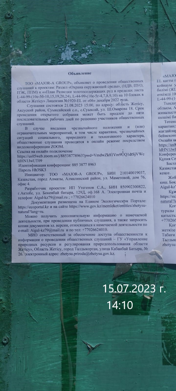 3. Общественные слушания организованны: Главный специалист УПР и ПР Жетысуйской области, zhumadilova.kamshat@mail.ru,