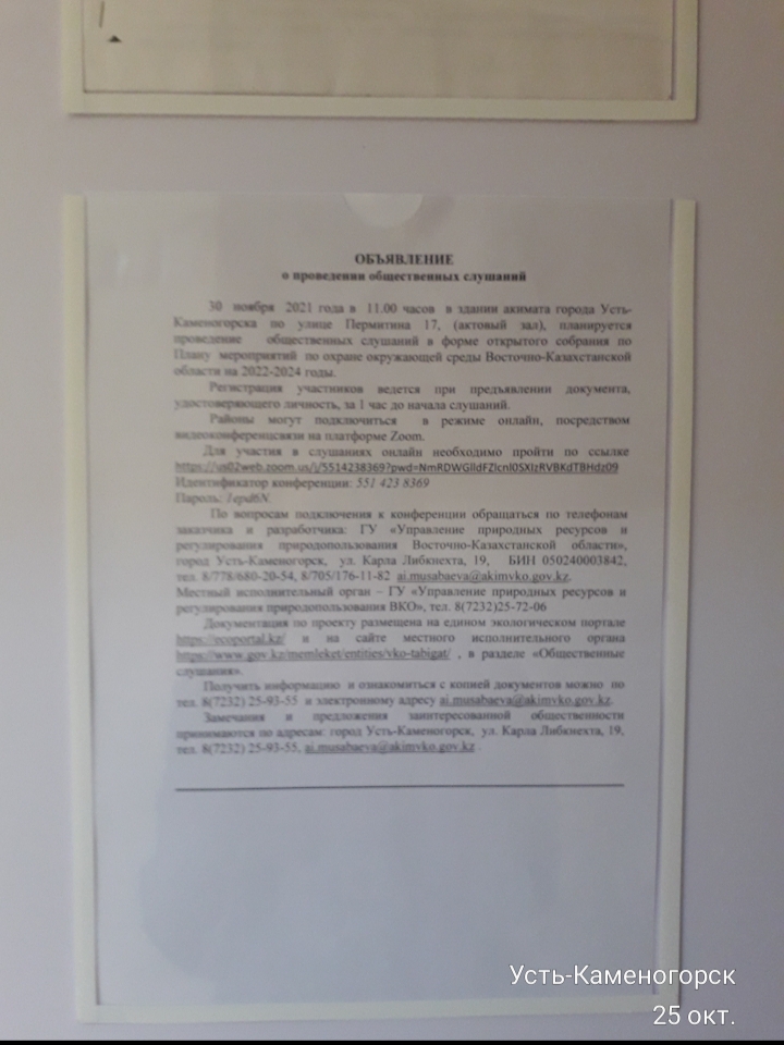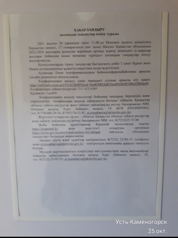 3. Общественные слушания организованны: Управление природных ресурсов и регулирования природопользования Восточно-Казахстанской области, a.abdraeva@akimvko.gov.kz,