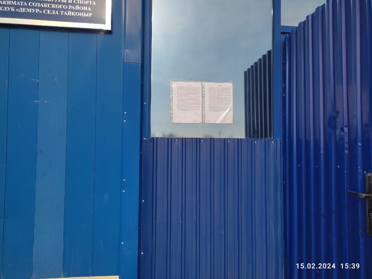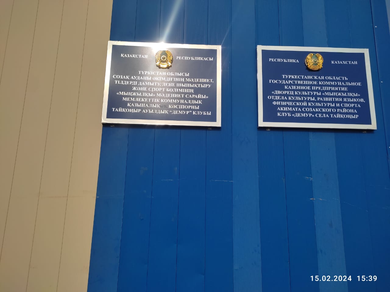 1.2. Место проведения: Туркестанская область, Сузакский район, Кыземшекская п.а., с.Тайконыр, дом культуры "DEMUR"