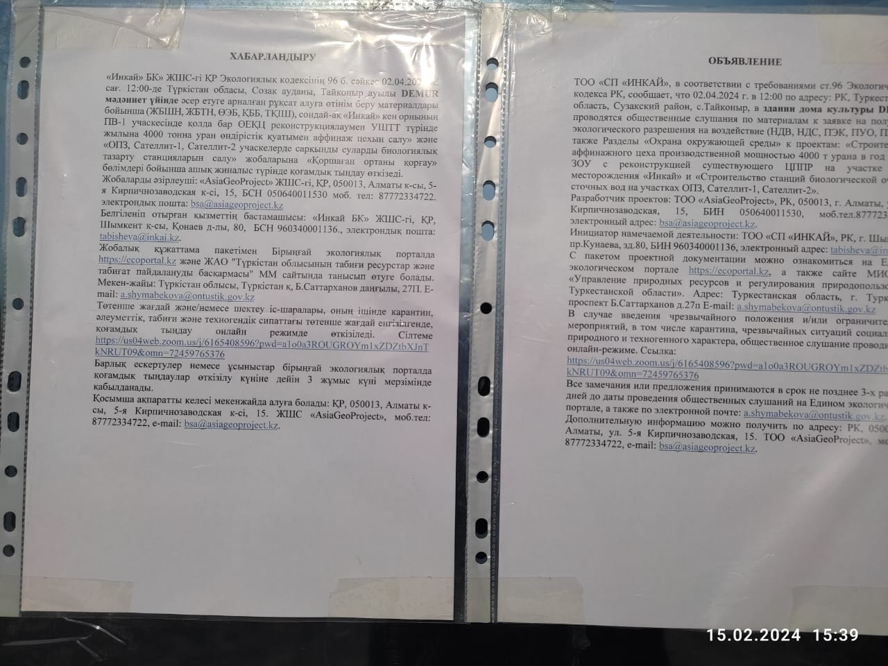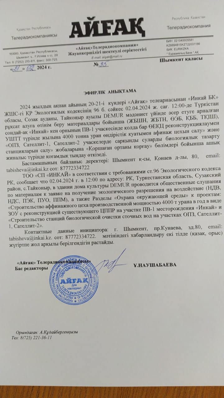 4. Повестка дня общественных слушаний: В связи со строительством в 2024 году на территории участков ОПЗ, Сателлит-1 и Саттелит- 2 станций биологической очистки сточных вод, а также строительства аффинажного цеха на участке ОПЗ согласно ст.122 Экологического Кодекса РК необходимо получить разрешение на эмиссии в окружающую среду. ТОО «СП «Инкай» зарегистрированное в Республике Казахстан 21 марта 1996 года, ведет работы по освоению месторождения Инкай уч.№№1, №2, №3 с 2000 года (Акт Государственной регистрации Контракта на проведение операций по недропользованию - № 507 от 13 июля 2000 года). ТОО СП «Инкай» расположено в западной части Сузакского района Туркестанской области в центральной части месторождения «Инкай». Крупные населённые пункты в районе месторождения отсутствуют. Ближайший участок ОПЗ располагается на расстоянии 10 км в северном направлении от вахтового лагеря. Поселок «Кыземшек» расположен к востоку на расстоянии 170 км. ТОО «СП «Инкай» занимается добычей методом подземного скважного выщелачивания на месторождении Инкай и переработкой урансодержащего сырья. Производительность полигона составляет - с объемом добычи урана 4000 т U/год в ХКПУ или по необходимости пероксида урана (желтый кек). В дальнейшем химический концентрат природного урана (в данном случае - пероксид урана, содержащий 65% урана) перерабатывается в закись-окись урана (ЗОУ). Для решения стратегической задачи ТОО «СП «Инкай», по выходу предприятия на добычу 4000т U/год в ЗОУ, рабочим проектом предусмотрено строительство Аффинажного цеха с установкой нового оборудования (прокалочная печь и сопутствующее оборудование поставки компании «Камеко»). Объемы работ, предусмотренные рабочим проектом, включают в себя строительство аффинажного цеха, трансформаторной подстанции с дизель-генератором и реконструкцию существующего Цеха переработки продуктивных растворов. Дополнительные объекты, находящиеся в технологической взаимосвязи с существующими промышленными объектами (ЦППР), располагаются на свободной от застройки территории и не требуют отвода дополнительного земельного участка. Проведение работ по рабочему проекту предусматривается в условиях установившегося производства без остановки технологического процесса добычи и первичной переработки. В районе расположения предприятия отсутствуют: селитебная зона, зоны отдыха, особо охраняемые природные территории, музеи, памятники истории и архитектуры. Объект представлен следующими промышленными площадками: Площадка №1−участок ОПЗ, Площадка №2− участок Сателлит-1, Площадка №3−участок Сателлит-2, Площадка №4− вахтовый лагерь, Площадка №5−полигон твёрдо-бытовых отходов (ТБО). Сточные воды на промплощадке представлены бытовыми сточными водами и производственными стоками (сточными водами пункта дезактивации, стоками от смывов полов, лабораторной посуды, котельной и аварийного душа пункта экстренной помощи), а также ливневыми и талыми водами. От санитарных приборов бытовые сточные воды бытовых помещений прачечной бытового комбината промплощадки отводятся самотёком через выпуски в наружную канализационную сеть и поступают в КНС. Проектом предусмотрена установка станции биологической очистки марки «ЛОС-Р-200м/10,50-9,40-2,60» для очистки сточных вод. Режим работы установки ЛОС-Р-200 по очистке сточных вод - к