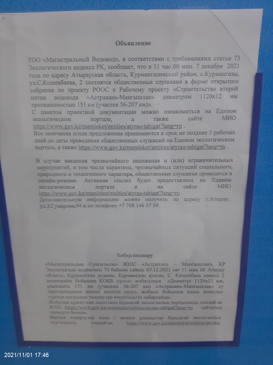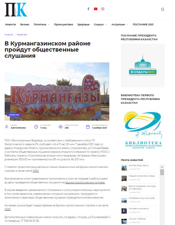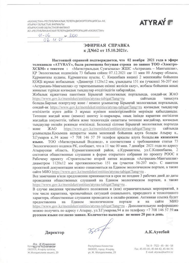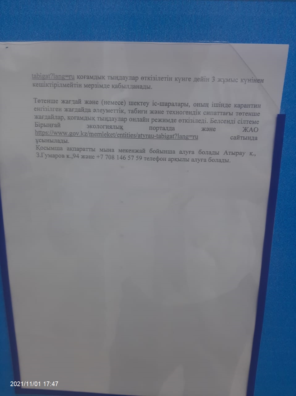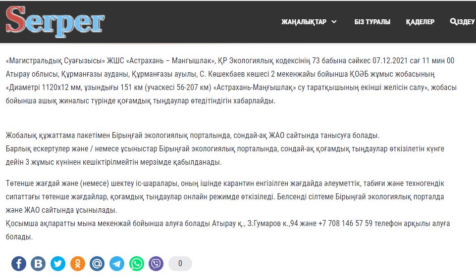 3. Общественные слушания организованны: Управление природных ресурсов и регулирования природопользования Атырауской области, a.aichikova@atyrau.gov.kz,