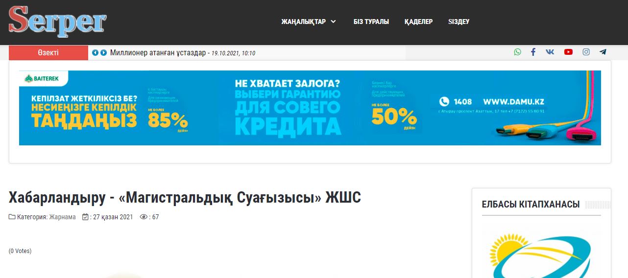 6.1. Наименование газеты, где будет размещено объявление: «Серпер» ТОО «Атырау-Акпарат»