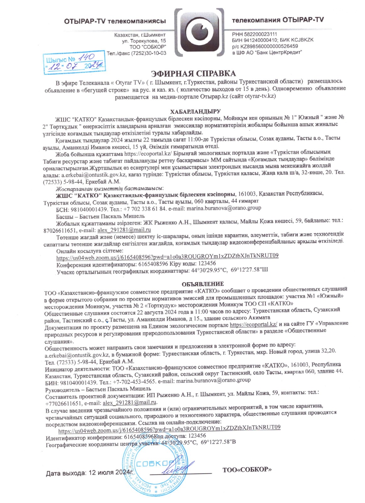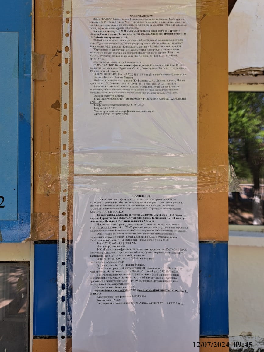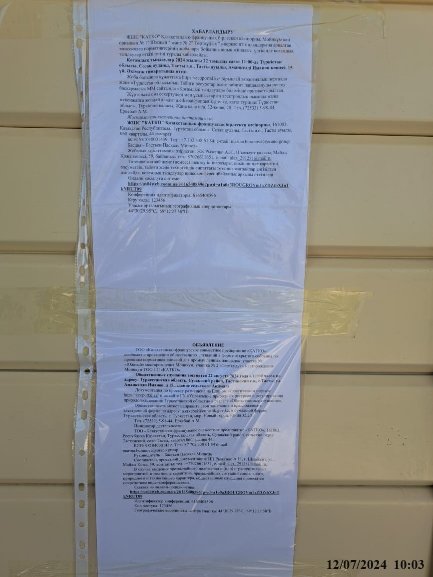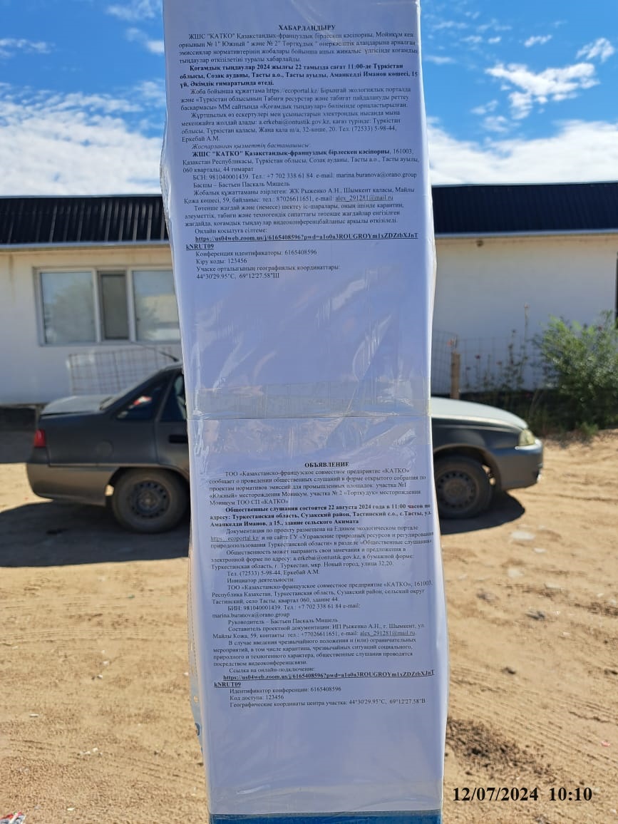 3. Общественные слушания организованны: Управление природных ресурсов и регулирования природопользования Туркестанской области, a.erkebai@ontustik.gov.kz,