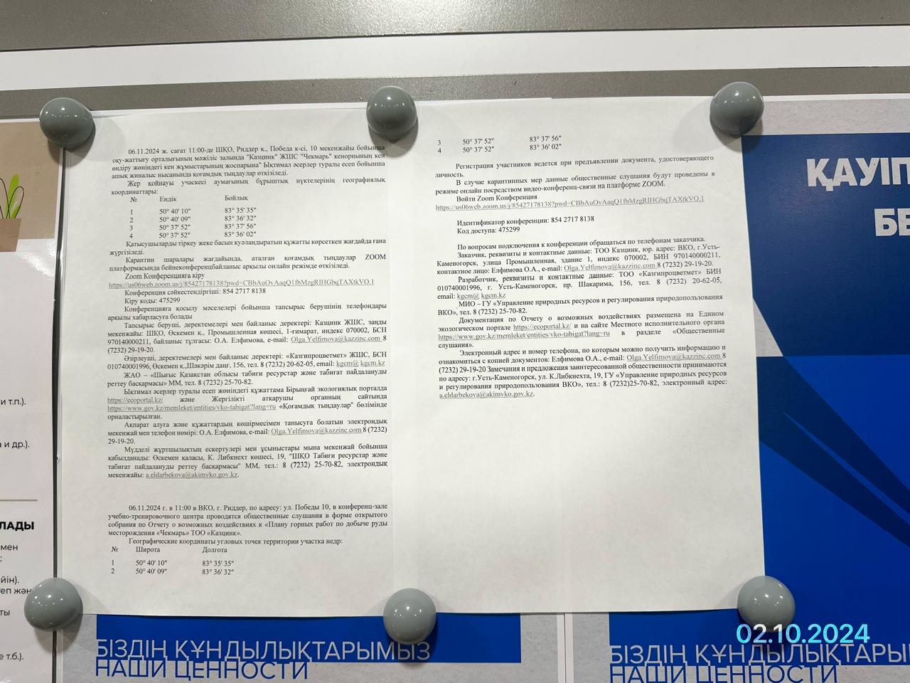 3. Общественные слушания организованны: Управление природных ресурсов и регулирования природопользования Восточно-Казахстанской области, a.eldarbekova@akimvko.gov.kz.,