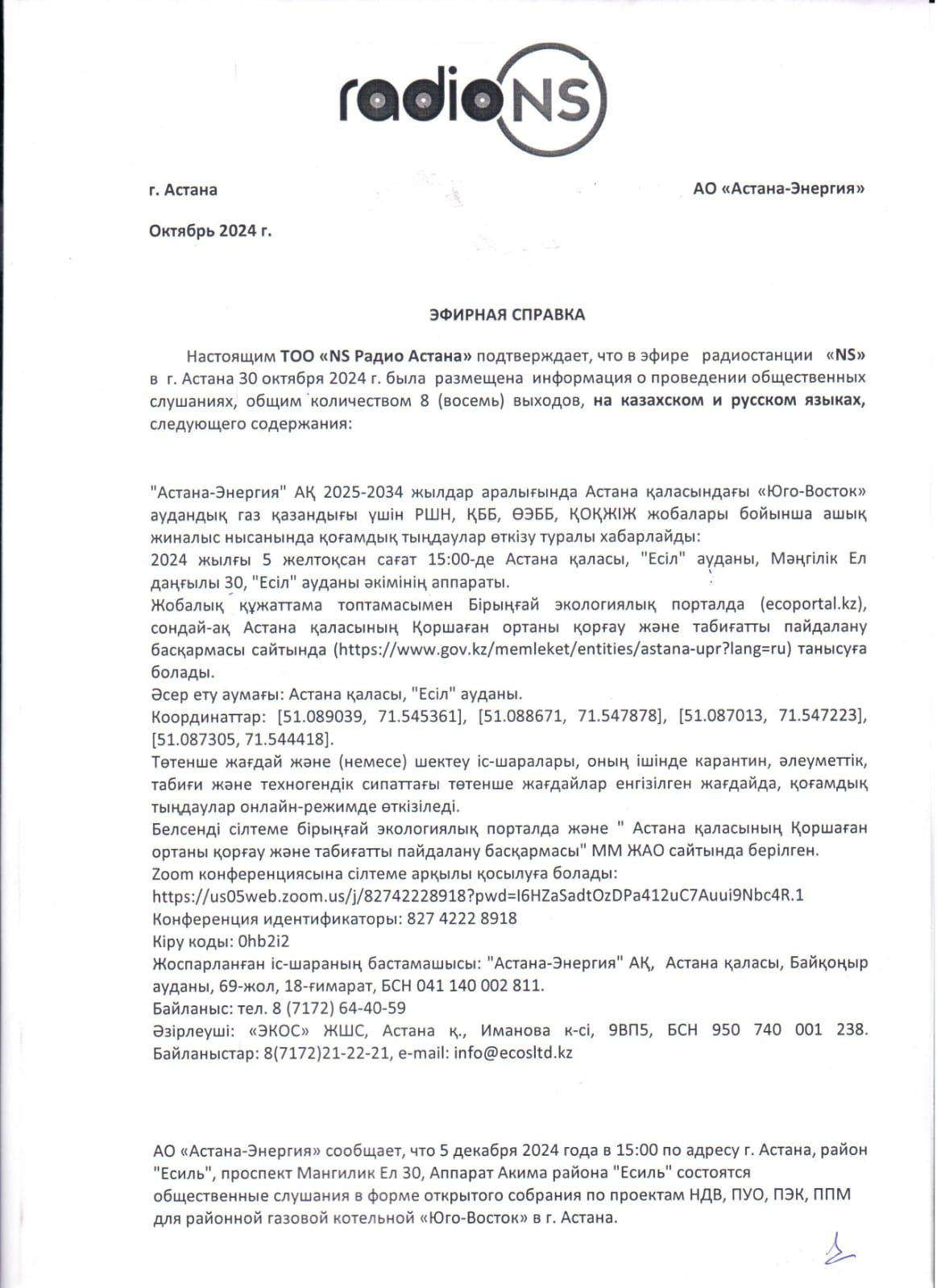 По проекту: НДВ, ПУО, ПЭК, ППМ для районной газовой котельной "Юго-Восток" в г. Астана