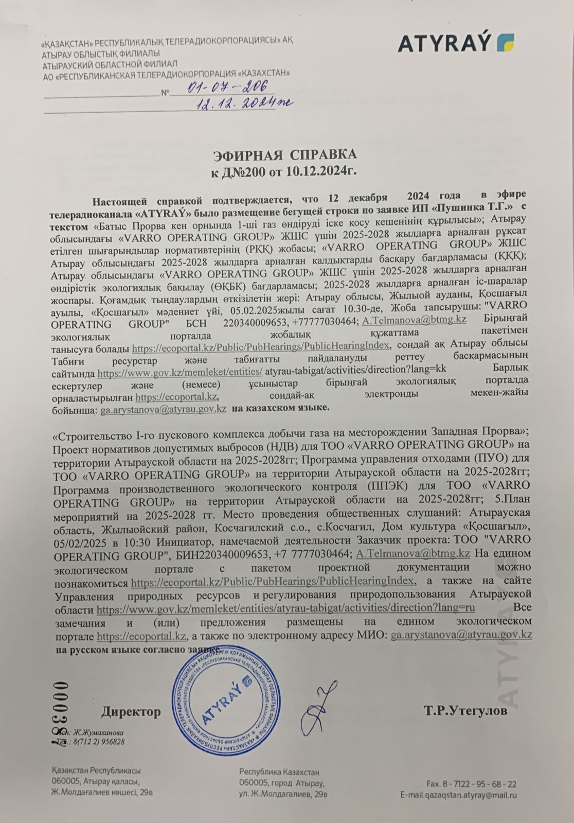 3. Общественные слушания организованны: Управление природных ресурсов и регулирования природопользования Атырауской области, ga.arystanova@atyrau.gov.kz ,
