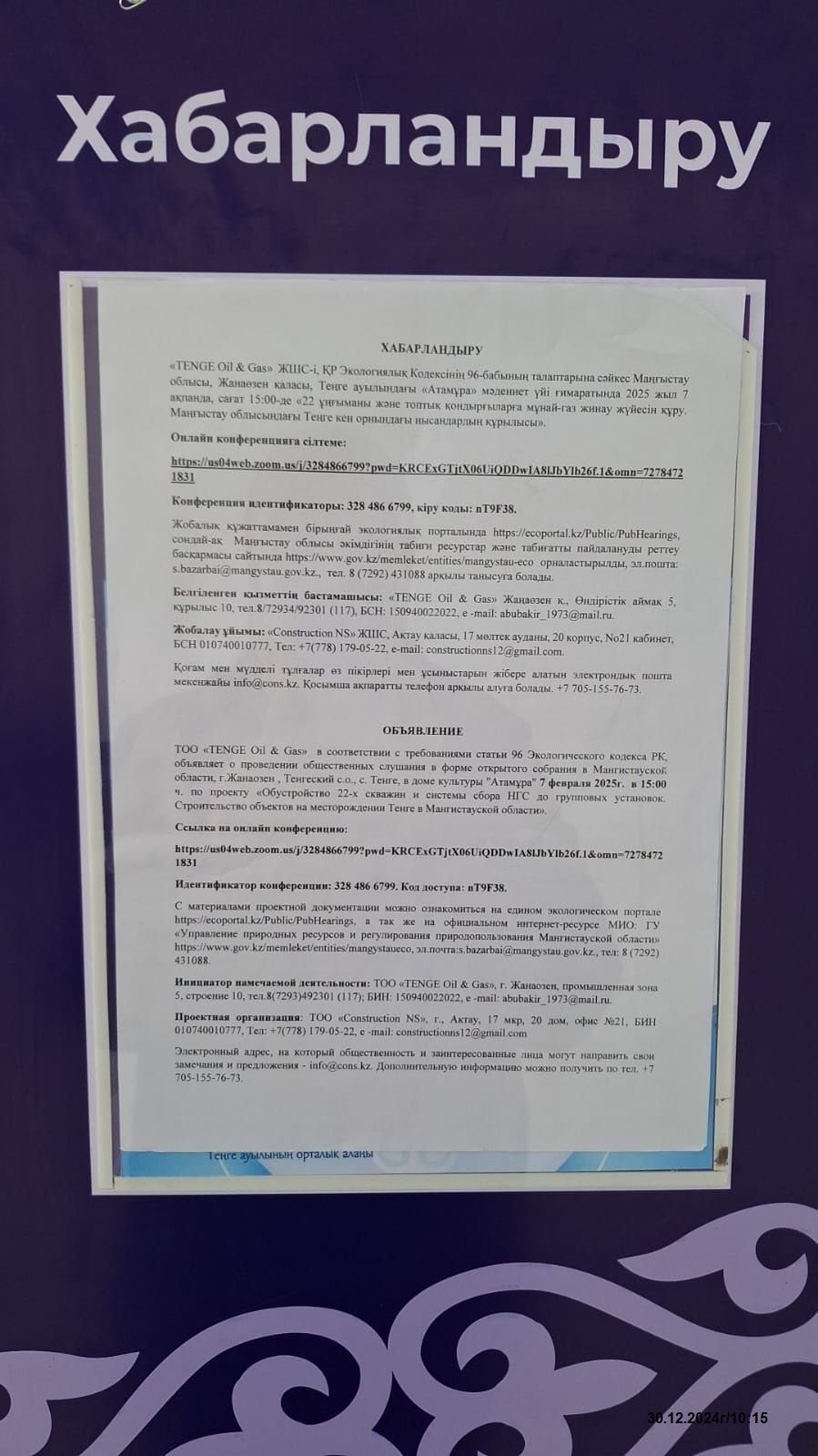 3. Общественные слушания организованны: Управление природных ресурсов и регулирования природопользования Мангистауской области, g.tulembet@mangystau.gov.kz,