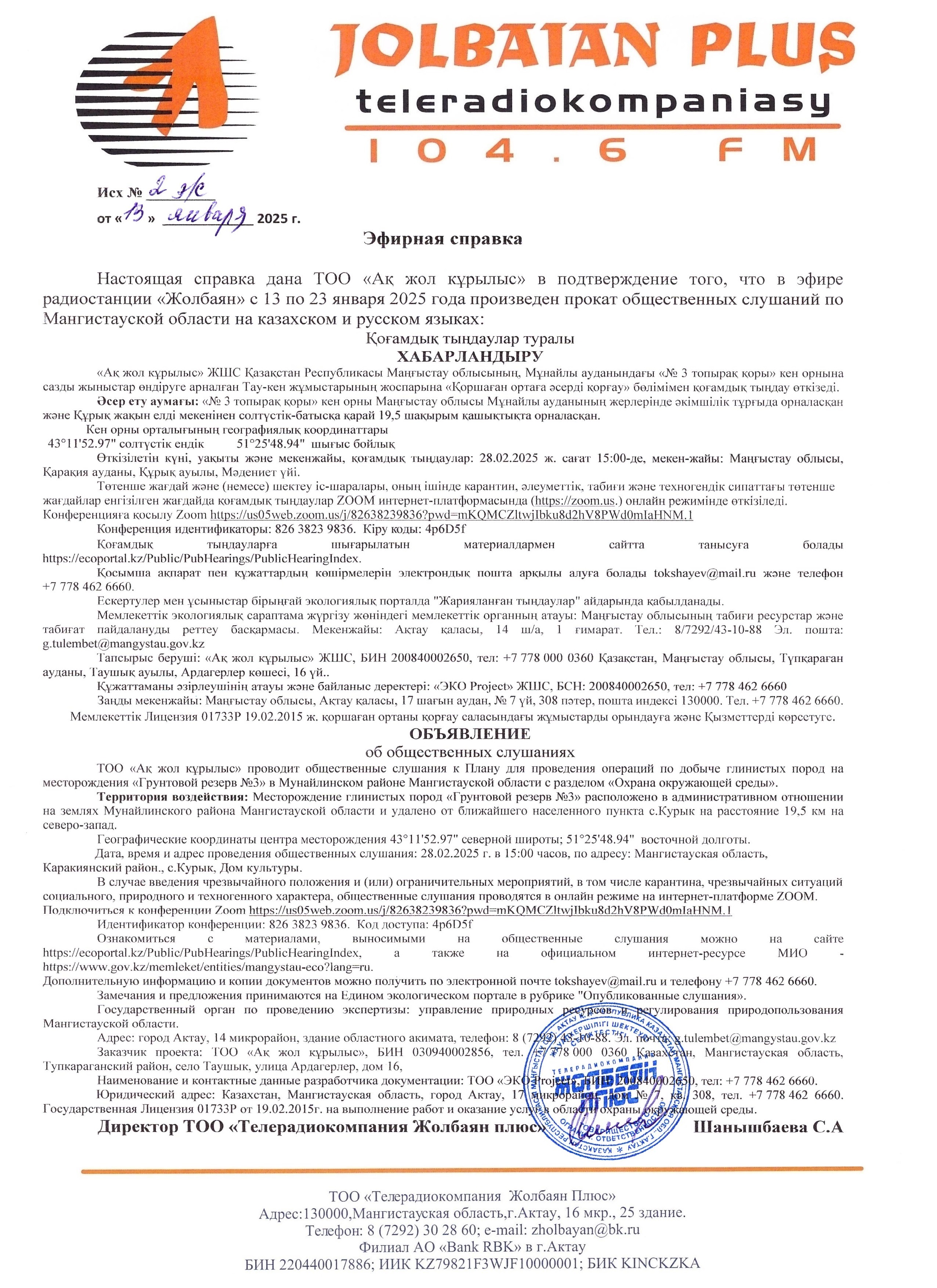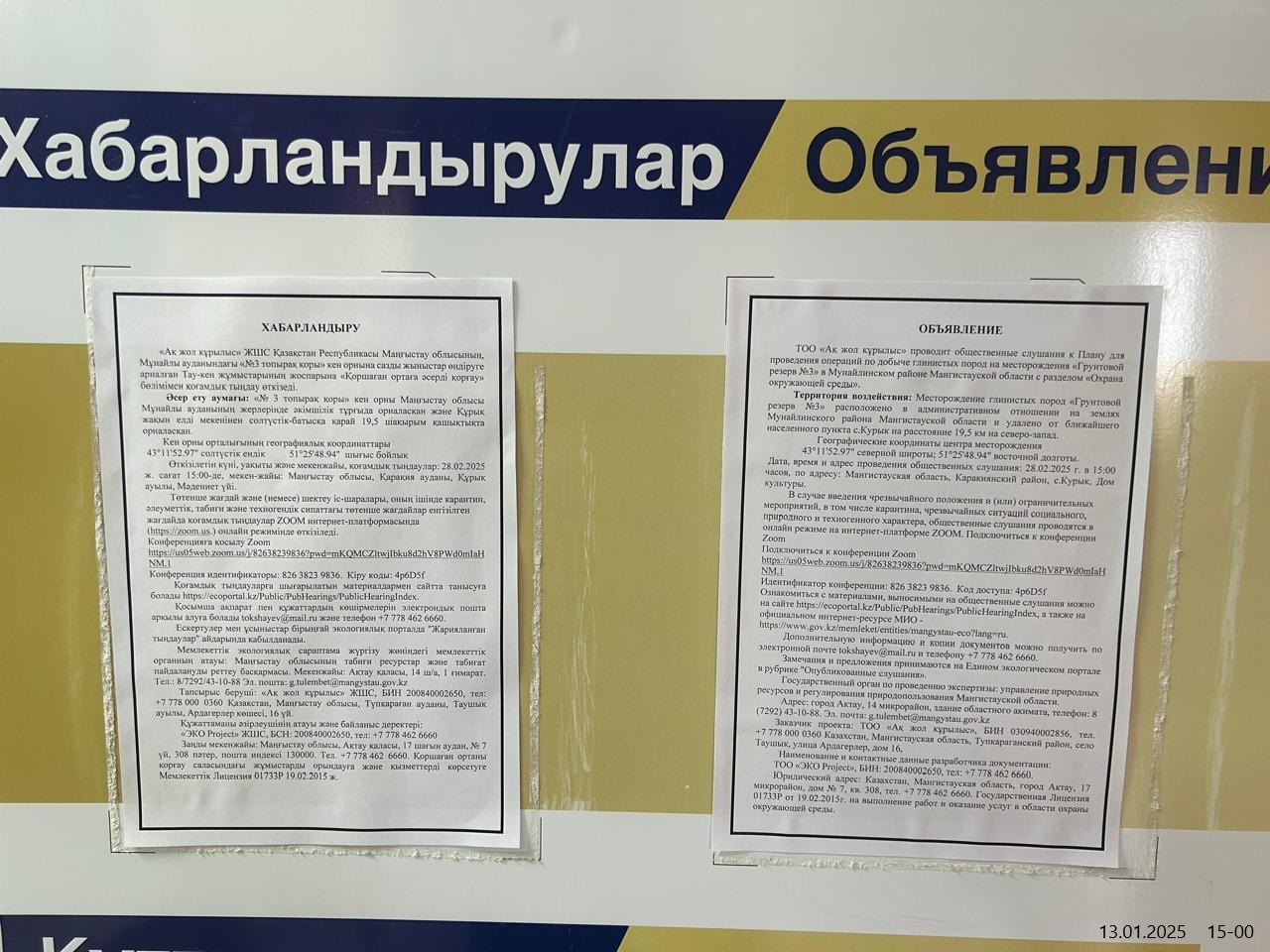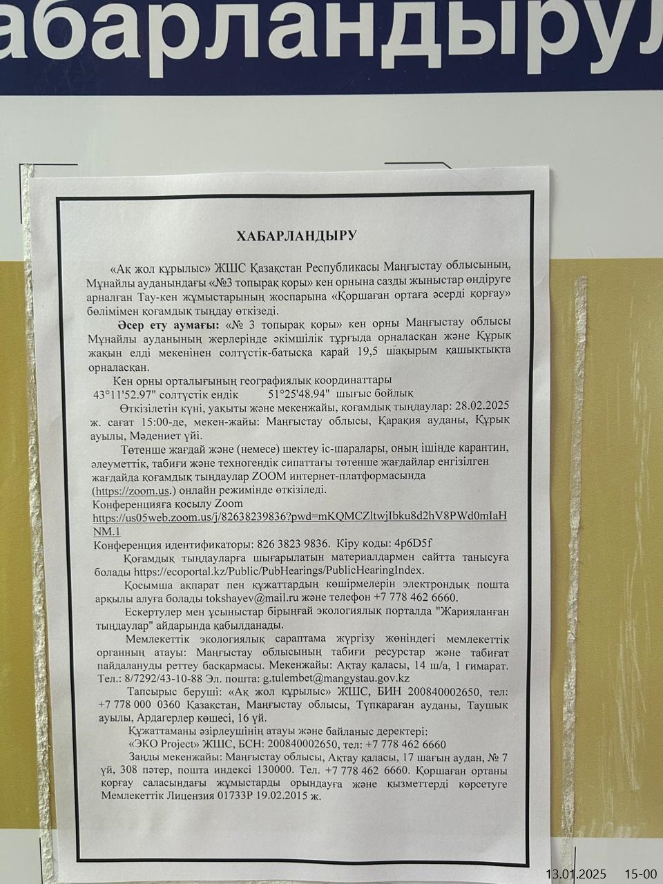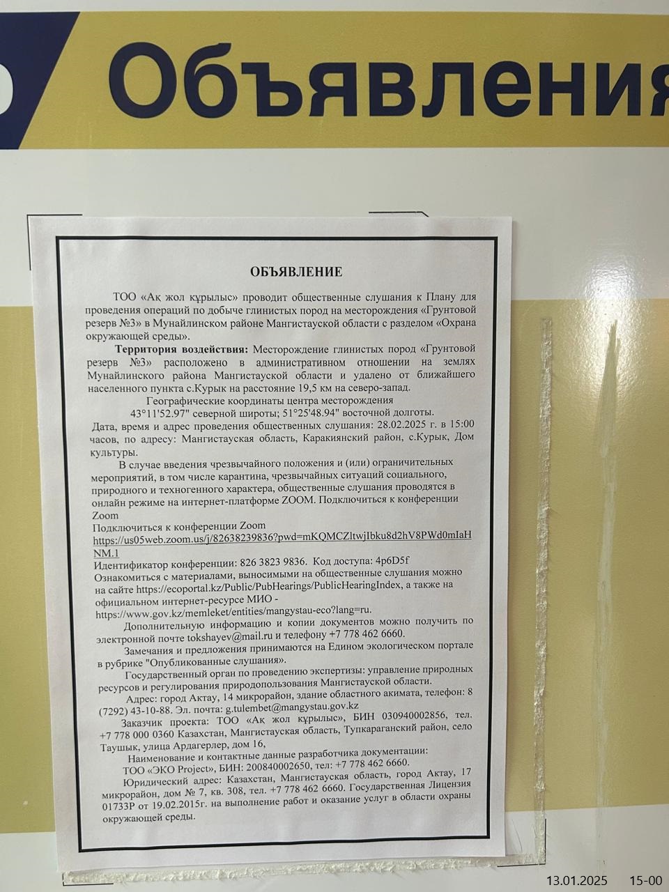 3. Общественные слушания организованны: Управление природных ресурсов и регулирования природопользования Мангистауской области, g.tulembet@mangystau.gov.kz,