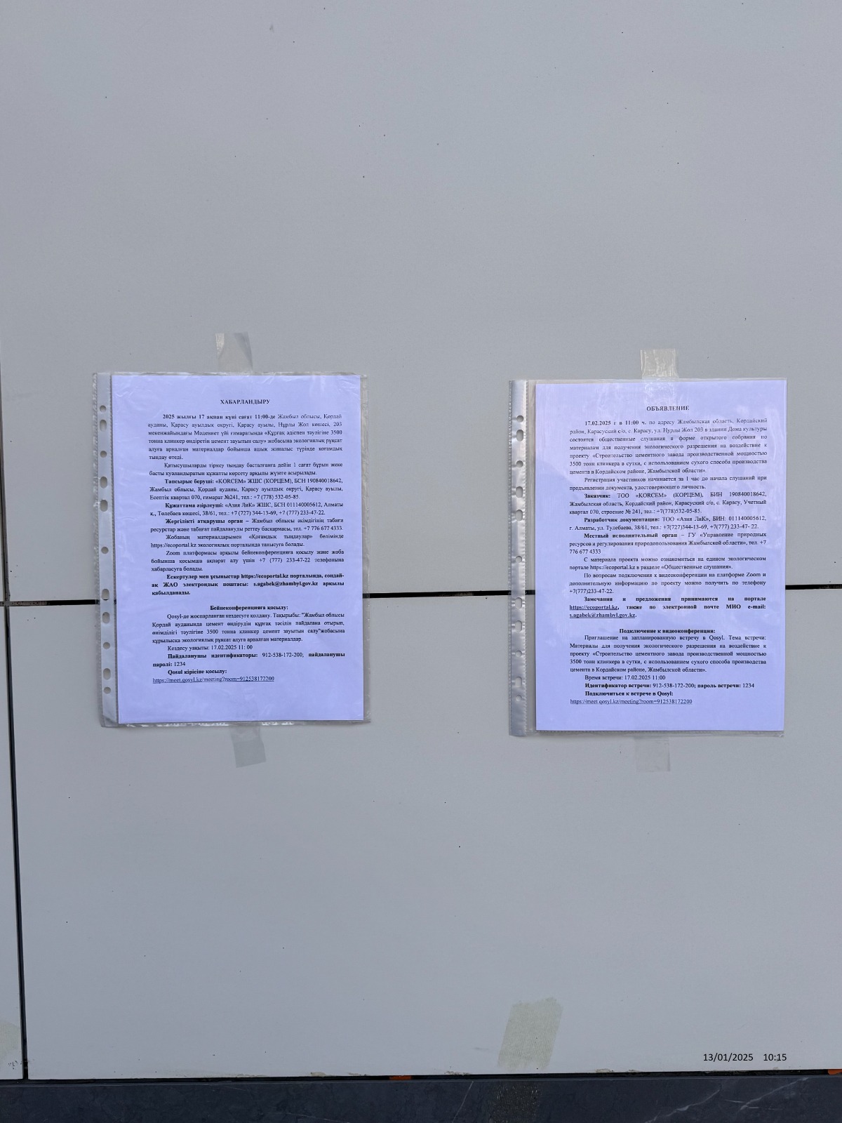 1.4. Описание для подключения к онлайн трансляции при прохождении общественного слушания: Приглашение на запланированную встречу в Qosyl Тема встречи: Материалы для получения экологического разрешения на воздействие к проекту «Строительство цементного завода производственной мощностью 3500 тонн клинкера в сутки, с использованием сухого способа производства цемента в Кордайском районе, Жамбылской области». Время встречи: 17.02.2025 11:00 Длительность встречи: 1 час. 30 мин. Идентификатор встречи: 912-538-172-200 Пароль встречи: 1234 Подключиться к встрече в Qosyl: https://meet.qosyl.kz/meeting?room=912538172200