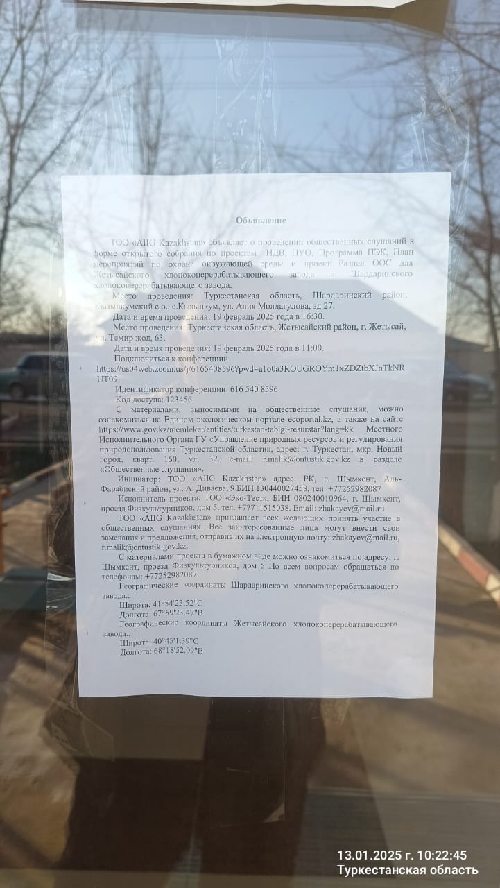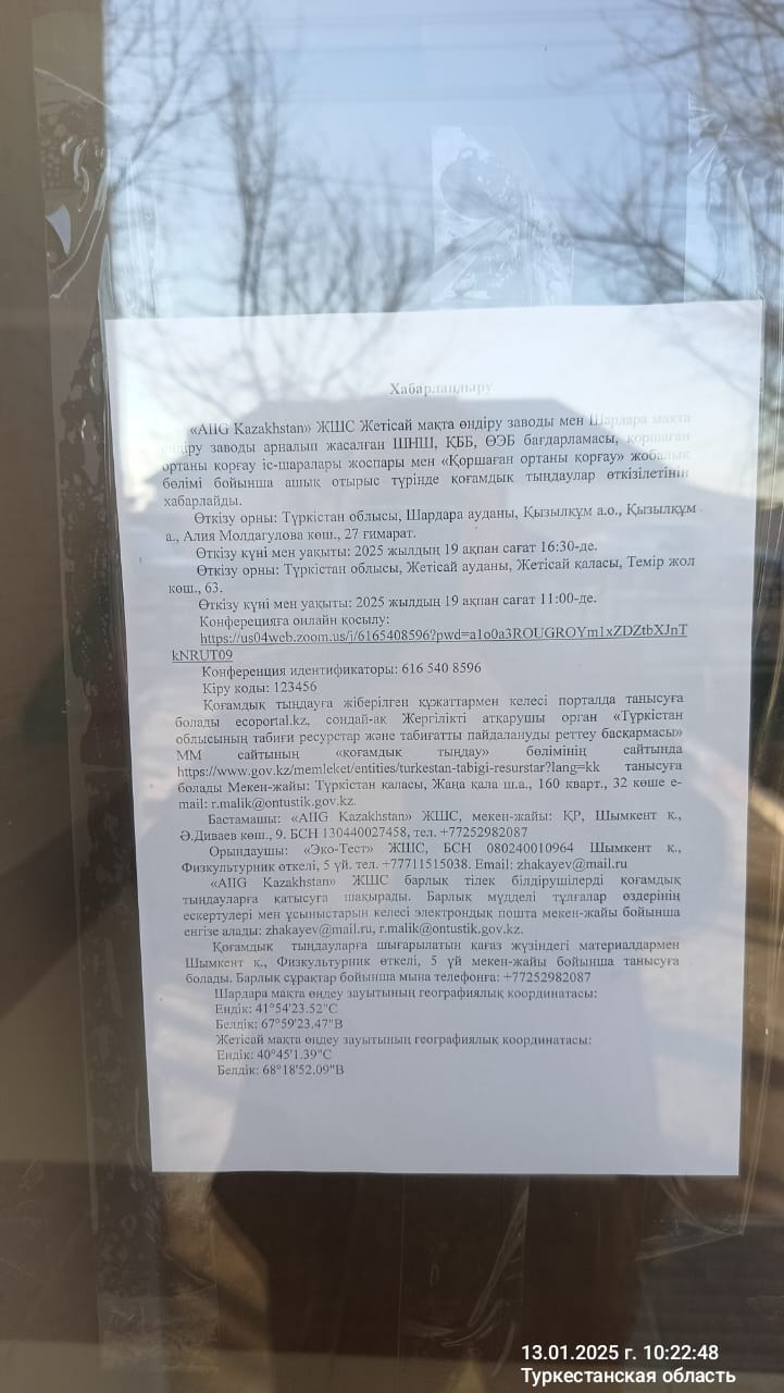3. Общественные слушания организованны: Управление природных ресурсов и регулирования природопользования Туркестанской области, a.erkebai@ontustik.gov.kz,