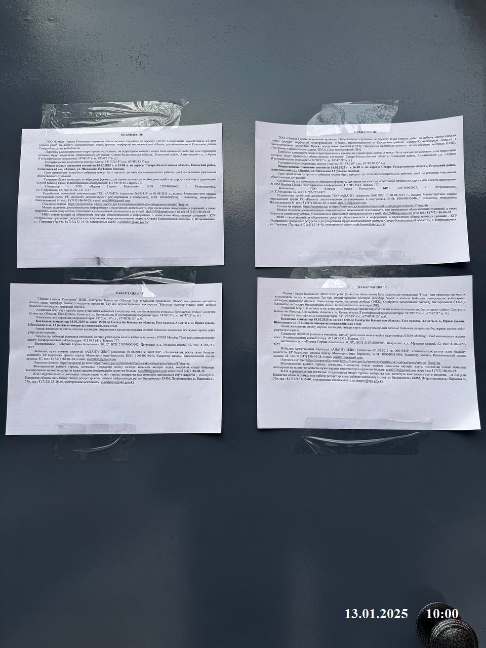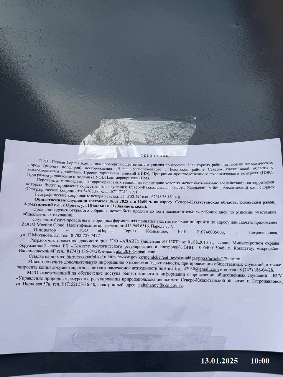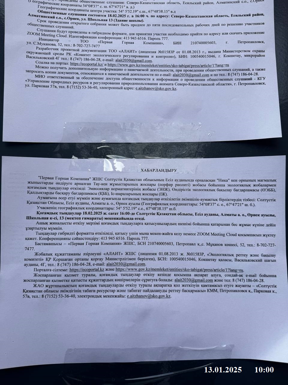 3. Общественные слушания организованны: Управление природных ресурсов и регулирования природопользования Северо-Казахстанской области, e.aitzhanov@sko.gov.kz,