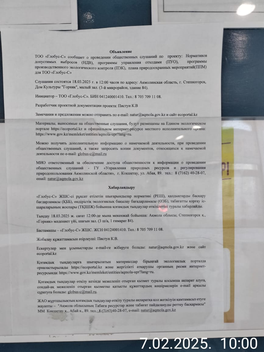 3. Общественные слушания организованны: Управление природных ресурсов и регулирования природопользования Акмолинской области, expeco@mail.ru,