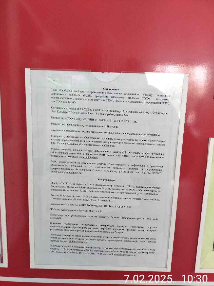 1.3. Контакты:globus-c@mail.ru; https://globus-c.kz/glavnaya/;