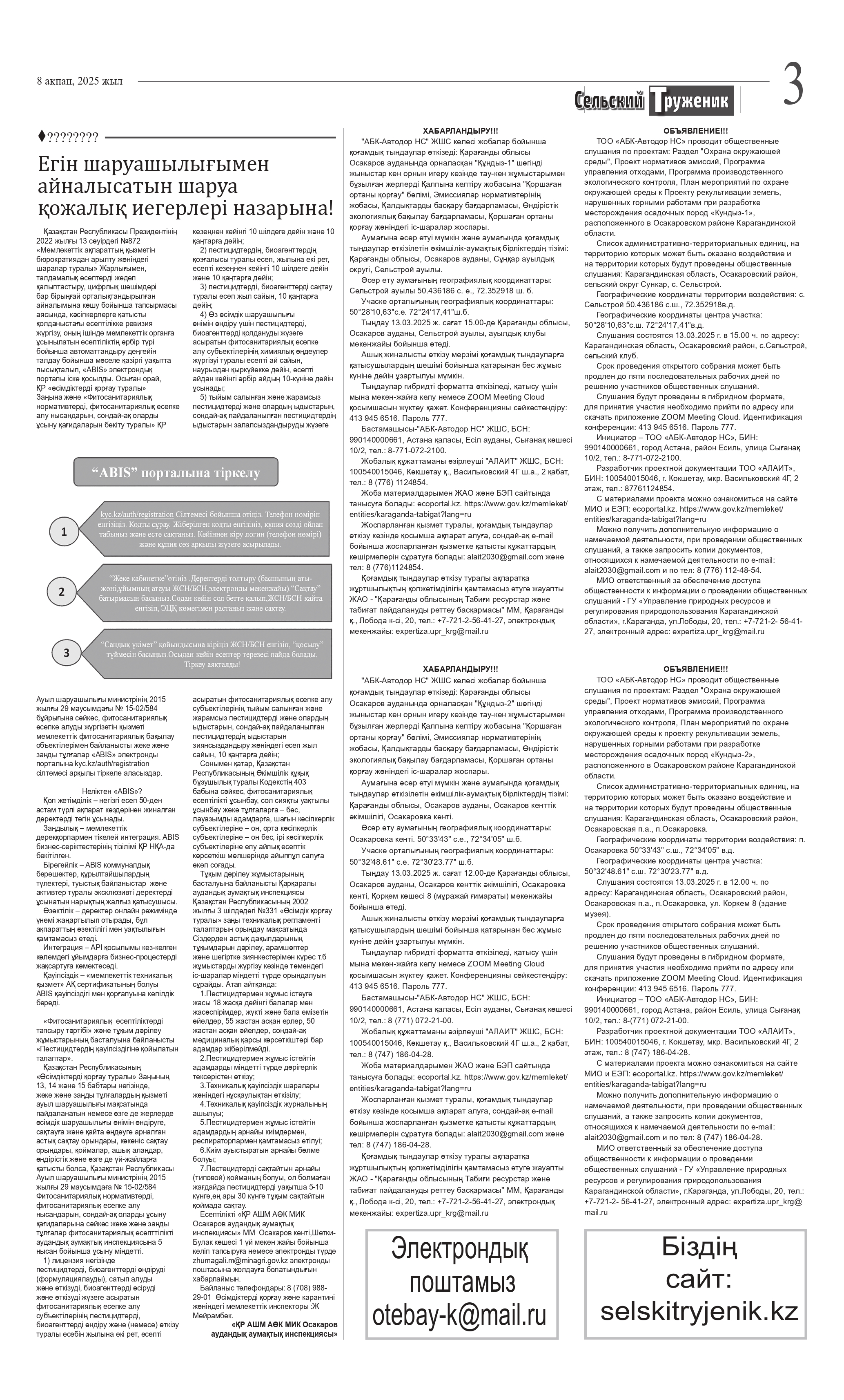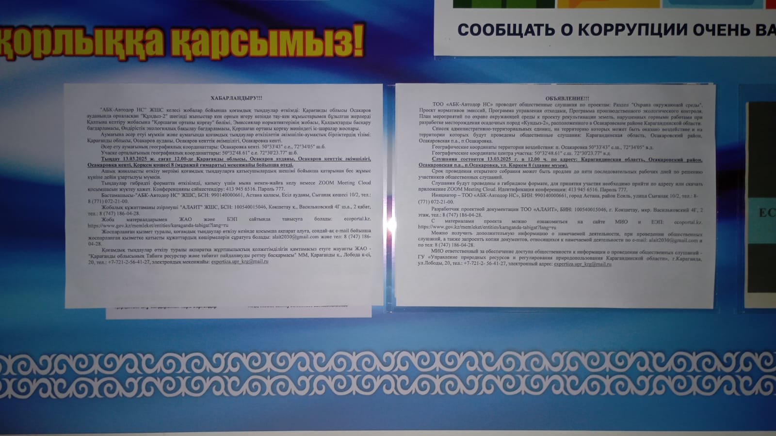 3. Общественные слушания организованны: Управление природных ресурсов и регулирования природопользования Карагандинской области, expertiza.upr_krg@mail.ru,