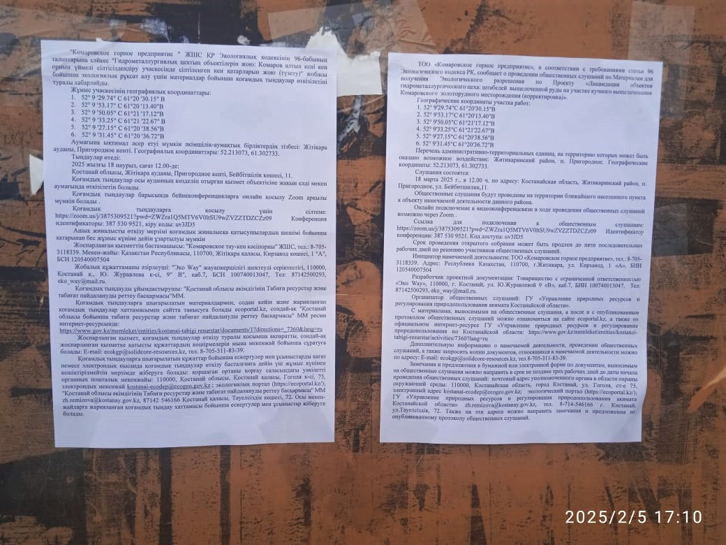 3. Общественные слушания организованны: Управление природных ресурсов и регулирования природопользования Костанайской области, zh.remizova@kostanay.gov.kz, 87142 546166,