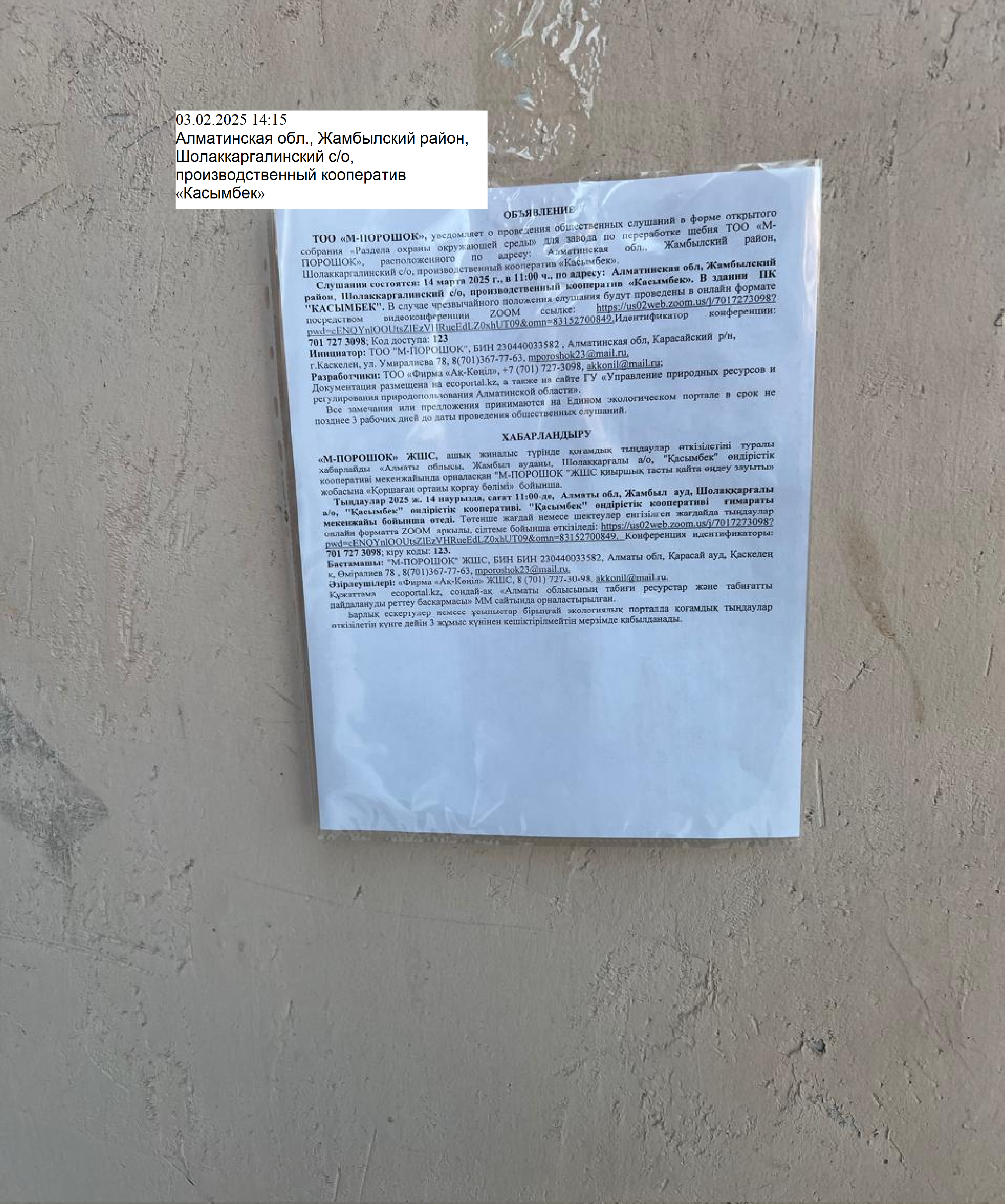 3. Общественные слушания организованны: Управление природных ресурсов и регулирования природопользования Алматинской области, 329267eco@mail.ru,