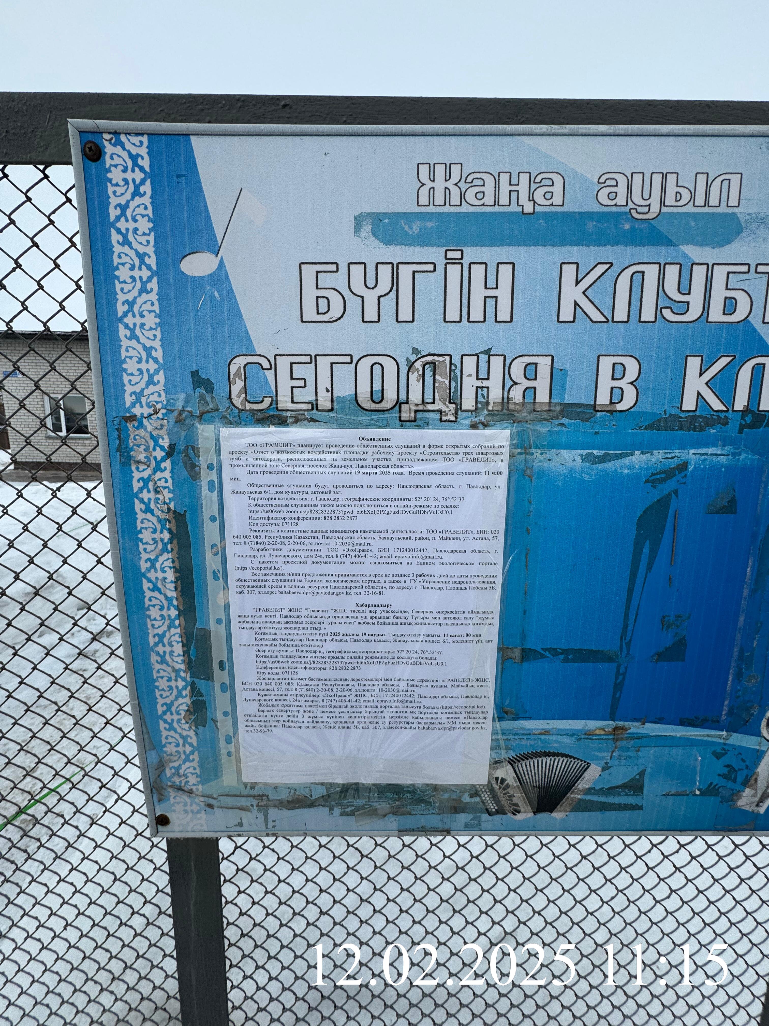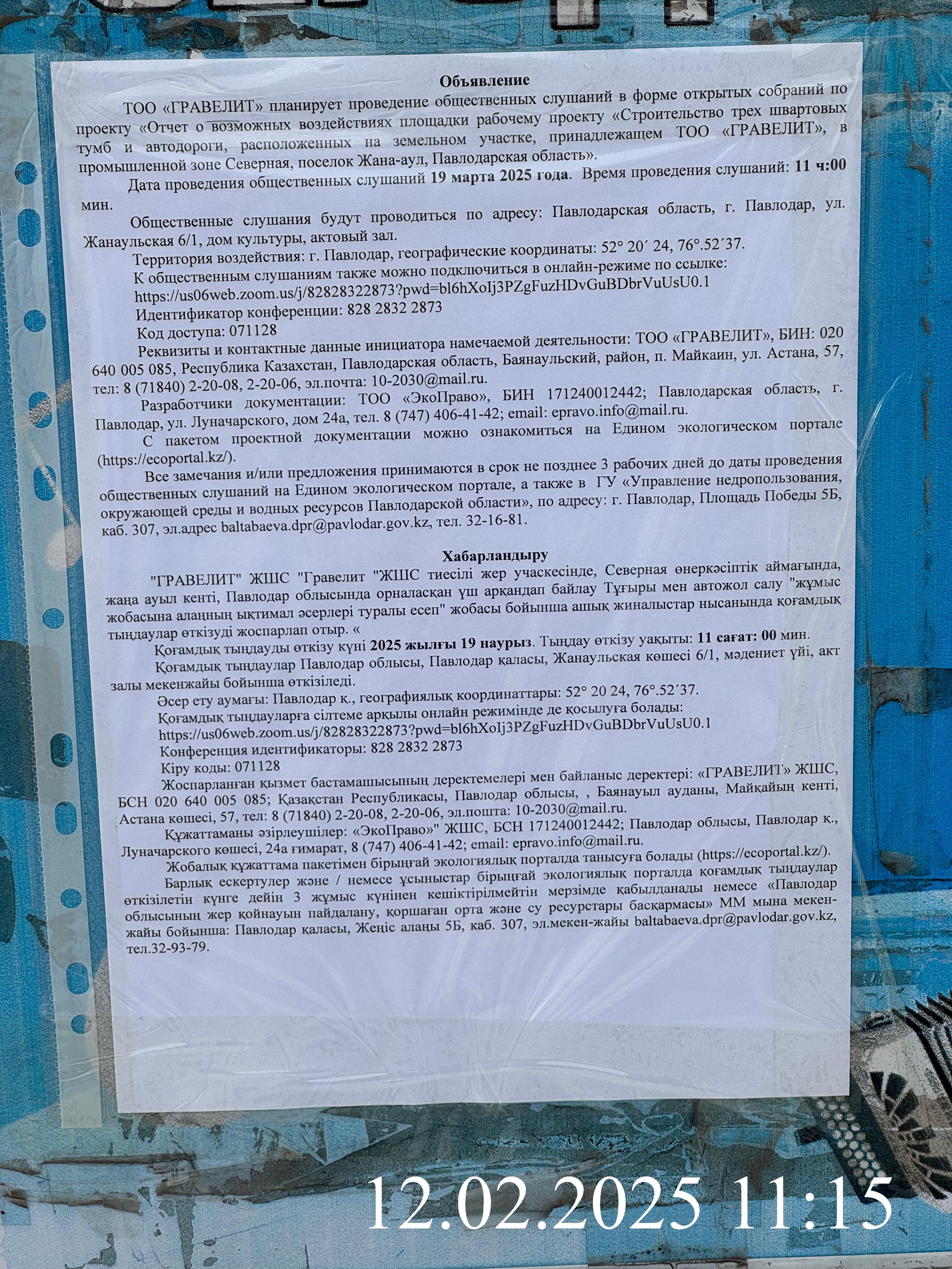 4. Повестка дня общественных слушаний: В настоящем Отчете о возможных воздействиях представлены материалы по описанию возможных существенных воздействий намечаемой деятельности на окружающую среду в соответствии с Инструкцией по организации и проведению экологической оценки (с изм. от 26.10.2021 г. №280). В проекте определены возможные отрицательные последствия от осуществления намечаемой деятельности предприятия, а именно при проведении строительства трех швартовых тумб и автодороги, расположенных на земельном участке, принадлежащем ТОО «ГРАВЕЛИТ», в промышленной зоне Северная, поселок Жана-аул, Павлодарская область, разработаны предложения и рекомендации по оздоровлению окружающей среды, предотвращению уничтожения, деградации, повреждения и истощения естественных экологических систем и природных ресурсов, обеспечению нормальных условий жизни и здоровья населения, проживающего в районе расположения намечаемой деятельности. Основной вид деятельности промплощадки предприятия – переработка строительного камня с получением строительного щебня и бутового камня. Производственные мощности ТОО «ГРАВЕЛИТ» размещаются на трех промышленных площадках: промплощадка №1 – дробильно-сортировочный комплекс – расположен в 1,5 км от поселка Майкаин; промплощадка №2 – железнодорожный тупик (тупиковый путь №7А –расположен в 7 км от поселка Майкаин, ст. Ушкулын; промплощадка №3 – производственная база - в г. Павлодар, п. Жана-аул. В настоящем отчете рассматривается только строительно-монтажные работы на промплощадке №3 – производственная база - в г. Павлодар, п. Жана-аул, при проведении строительства трех швартовых тумб и автодороги, расположенных на земельном участке, принадлежащем ТОО «ГРАВЕЛИТ». Целью намечаемой деятельности является – строительство швартовых тумб, предназначенных для удержания судна у причала во время стоянки. Они устанавливаются на причальных сооружениях и служат для крепления швартовых канатов и тросов. К общественным слушаниям также подключиться в онлайн-режиме по ссылке: https://us06web.zoom.us/j/82828322873?pwd=bl6hXoIj3PZgFuzHDvGuBDbrVuUsU0.1 Идентификатор конференции: 828 2832 2873 Код доступа: 071128