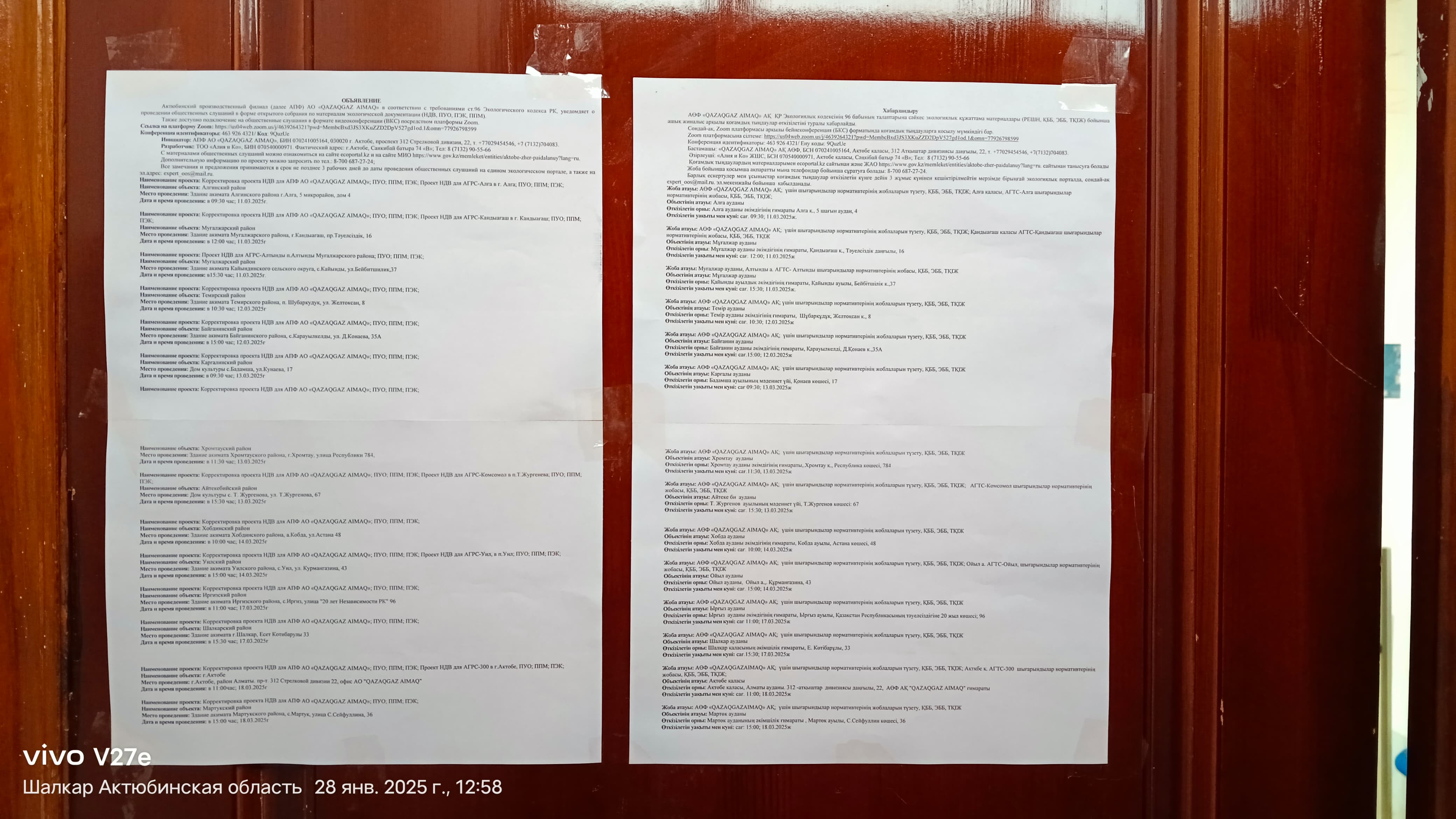 6. Объявление о проведении общественных слушаний на казахском и русском языках будет распространено следующими способами: