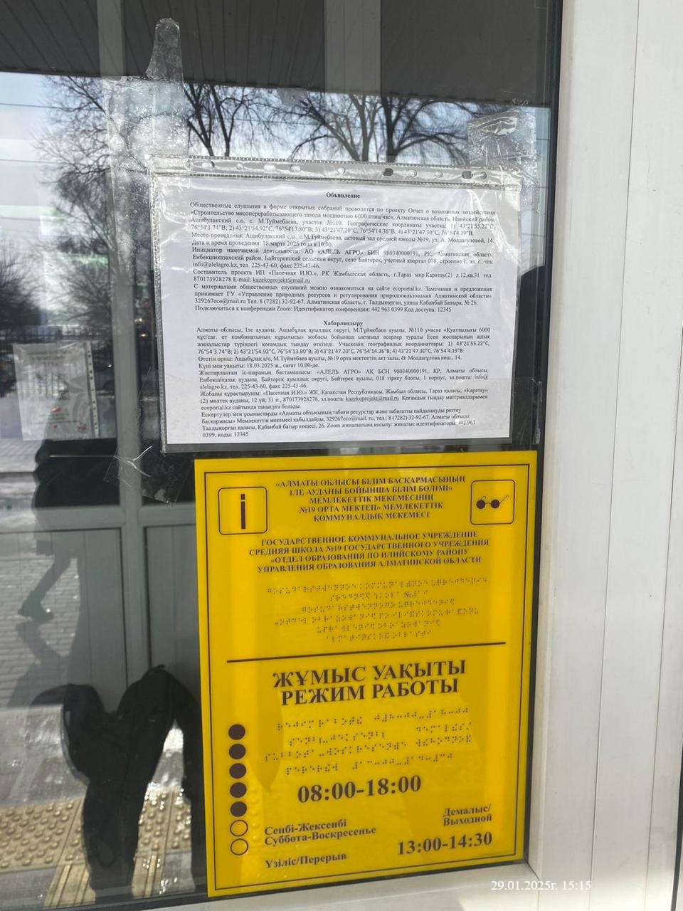 6. Объявление о проведении общественных слушаний на казахском и русском языках будет распространено следующими способами: