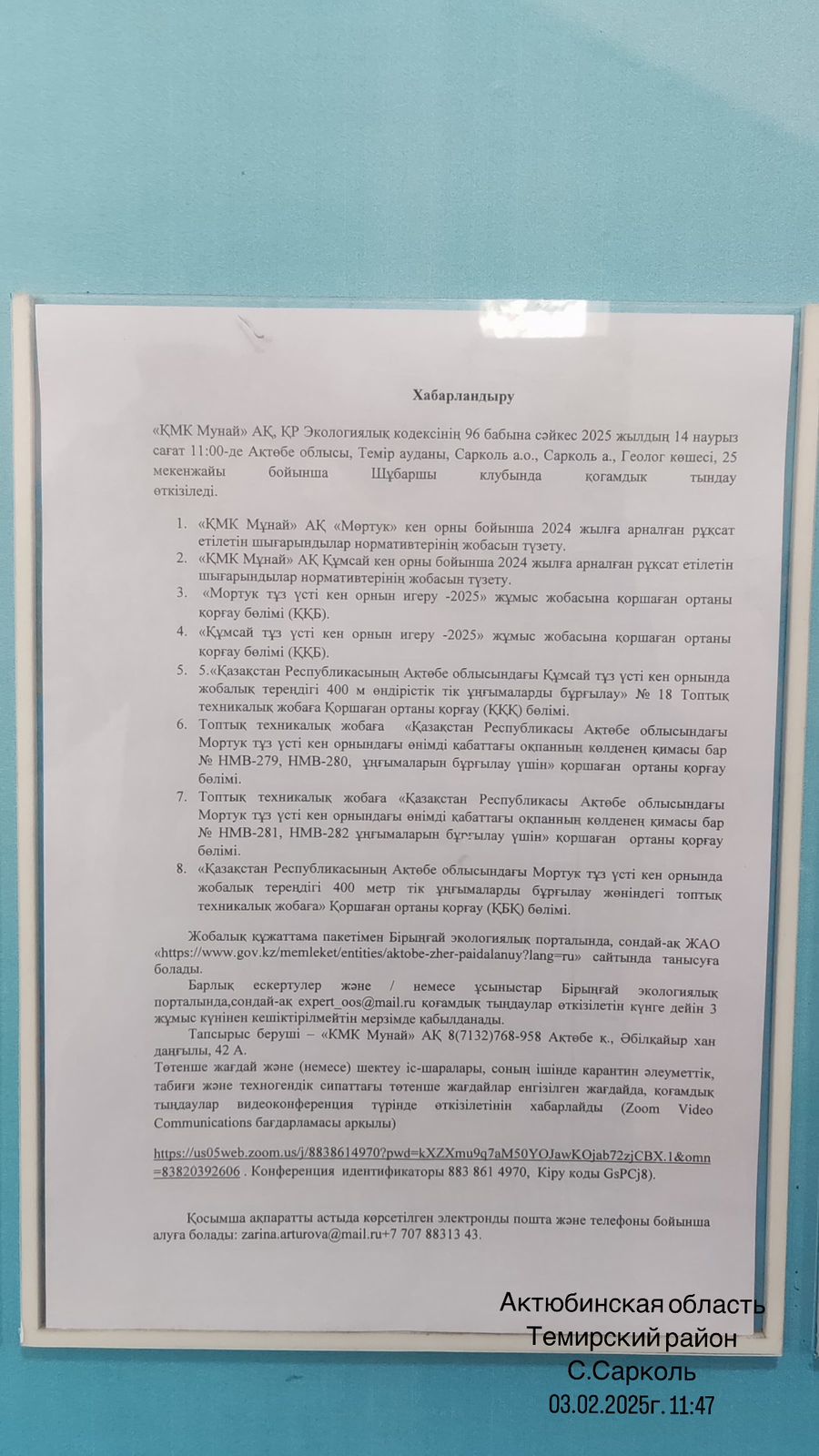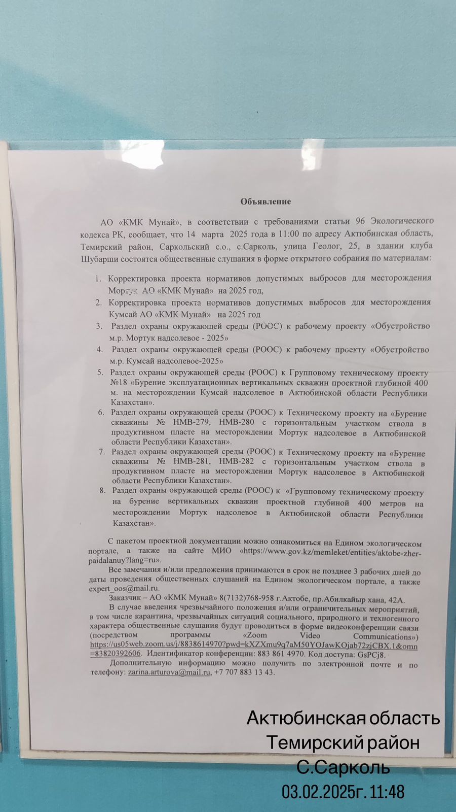 4. Повестка дня общественных слушаний: АО «КМК Мунай» осуществляет разведку и добычу УВС на 3-х месторождениях: Кокжиде, Кумсай, Мортук. Южная граница месторождения Мортук располагается на левобережье р.Темир и граничит с площадкой месторождения Кокжиде. Северо-западная граница месторождения Мортук проходит по пойме р.Темир, к востоку – в 5 км от п.Кенкияк. На юге граничит с месторождением Мортук, в 10 км к югу от месторождения расположен п.Шенгельши. В 2 км к северо-западу от месторождения расположены п.Шубарши и п. Сорколь. Часть месторождения Мортук граничит с контрактной территорией месторождения Кенкияк АО «СНПС-Актобемунайгаз». Климат района резко-континентальный с жарким сухим летом, холодной зимой, с большими суточными и сезонными колебаниями температуры воздуха. Сильные ветры восточного и северо-восточного направлений летом часто вызывают суховей, песчаные бури, а зимой снежные бураны. Максимальная температура летом +30 -+35ºС, минимальная зимой минус 35 – минус 40ºС. Среднегодовое количество осадков до 260 мм выпадает в зимне-весенний период. Подключиться к конференции Zoom https://us05web.zoom.us/j/8838614970?pwd=kXZXmu9q7aM50YOJawKOjab72zjCBX.1&omn=83820392606 Идентификатор конференции: 883 861 4970 Код доступа: GsPCj8