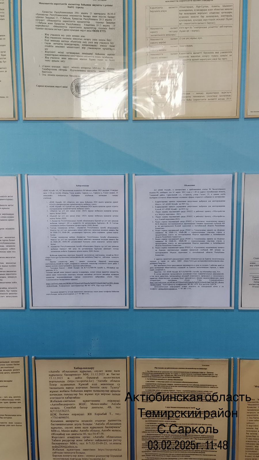 6.3. расположение мест, специально предназначенных для Размещения печатных объявлений (доски объявлений): Актюбинская область, Темирский район, Саркольский с.о., с.Сарколь, улица Мектеп 32, в здании Акимата